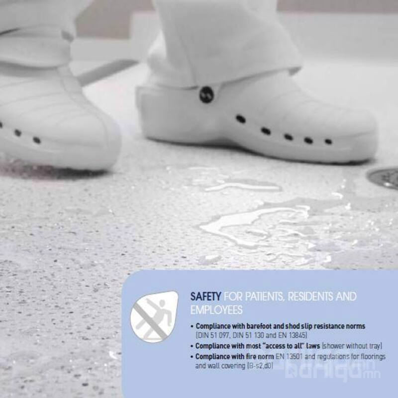 Халтиралтын зэрэг R11: Бассейн, угаалгын, хувцас солих өрөөний хамгийн тохиромжтой шийдэл. Тусгай зориулалтын шал нь нойтон болон чийгтэй үед хөл нүцгэн алхахад халтирахгүй.