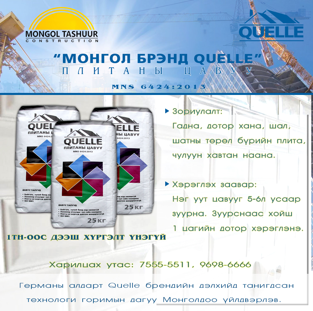 Манай компани 201 оноос эхлэн QUELLE брэндийн барилгын дотор болон гадна фасадны хар замаск, хөөсөнцрийн цавуу, плитаны чигжээс, плитаны цавуу зэрэг бүтээгдэхүүнийг Германы QUELLE брэндийн тоног төхөөрөмж, технологийн гормийн дагуу үйлдвэрлэж байгаа бөгөөд өдөрт 70-90 тн, жилдээ 25-30 мянган тн бүтээгдэхүүн үлйдвэрлэх хүчин чадалтай үйлдвэр юм. Тус компани нь үйлдвэрлэл, бүтээгдэхүүний нэр төрлөө өргөжүүлэн 2014 онд өдөрт 80 тн бүтээгдэхүүн үйлдвэрлэх хүчин чадалтай цагаан замаскны үйлдвэрийг шинээр ашиглалтанд оруулсан бөгөөд Монгол улсад хамгийн анхны цагаан замаскны үйлдвэр юм. Бидний үйлдвэрлэж буй бүтээгдэхүүнүүд нь MNS 6424:2013, MNS 5526:2005 зэрэг Монгол улсын чанар стандартын шаардлагыг бүрэн хангасан, импортыг орлох цаашид экспортод гаргах боломжтой бүтээгдэхүүн юм.