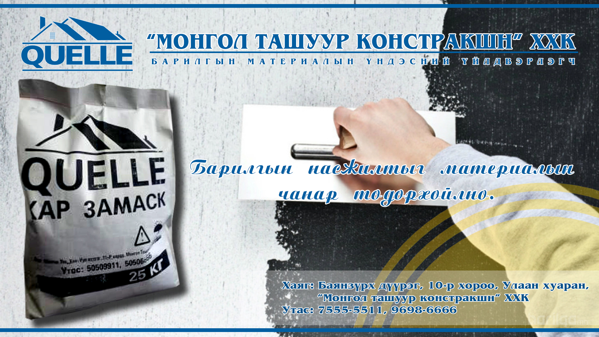 Манай компани 201 оноос эхлэн QUELLE брэндийн барилгын дотор болон гадна фасадны хар замаск, хөөсөнцрийн цавуу, плитаны чигжээс, плитаны цавуу зэрэг бүтээгдэхүүнийг Германы QUELLE брэндийн тоног төхөөрөмж, технологийн гормийн дагуу үйлдвэрлэж байгаа бөгөөд өдөрт 70-90 тн, жилдээ 25-30 мянган тн бүтээгдэхүүн үлйдвэрлэх хүчин чадалтай үйлдвэр юм.