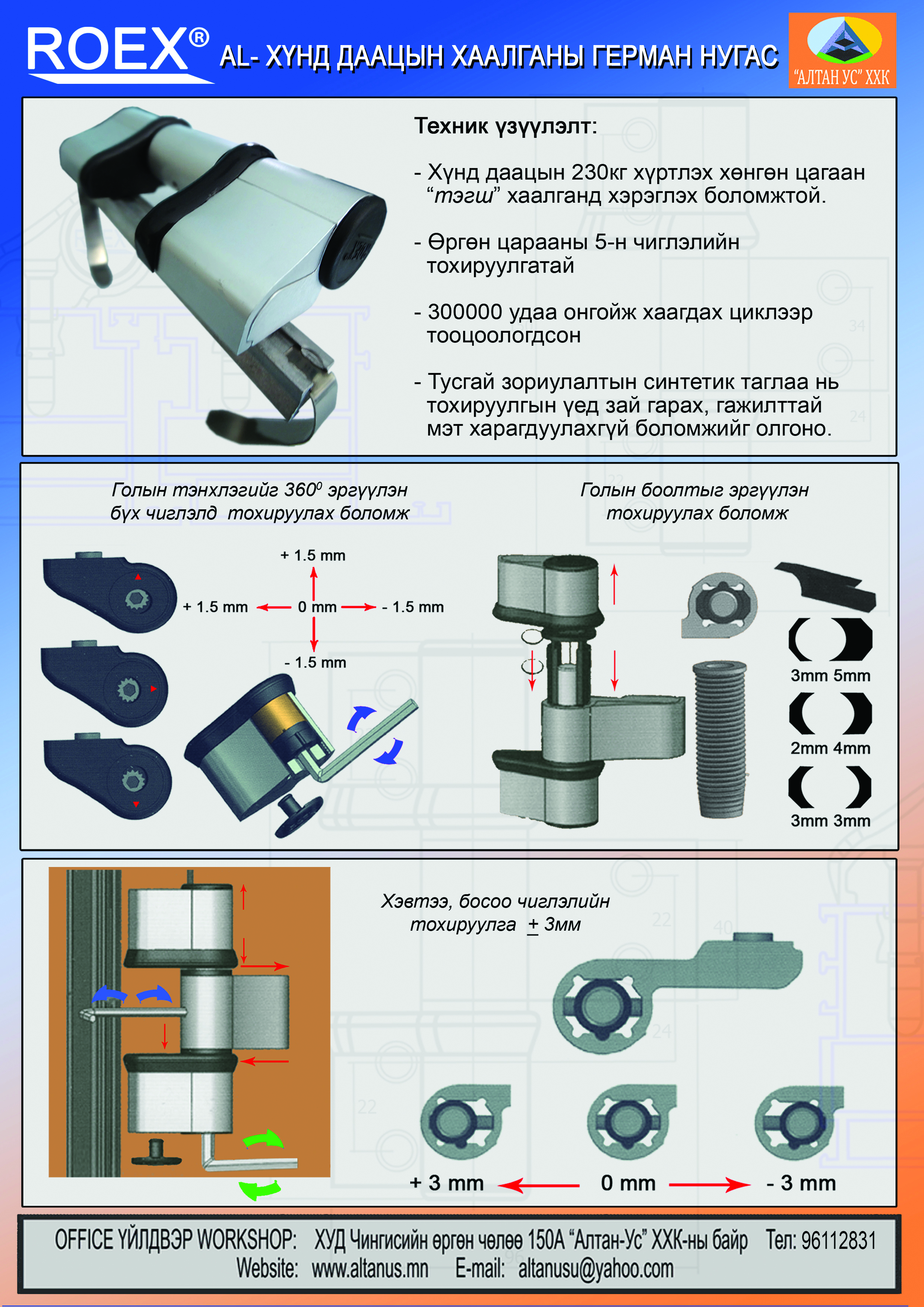 - Хүнд даацын 230кг хүртлэх хөнгөн цагаан "тэгш" хаалганд хэрэглэх.