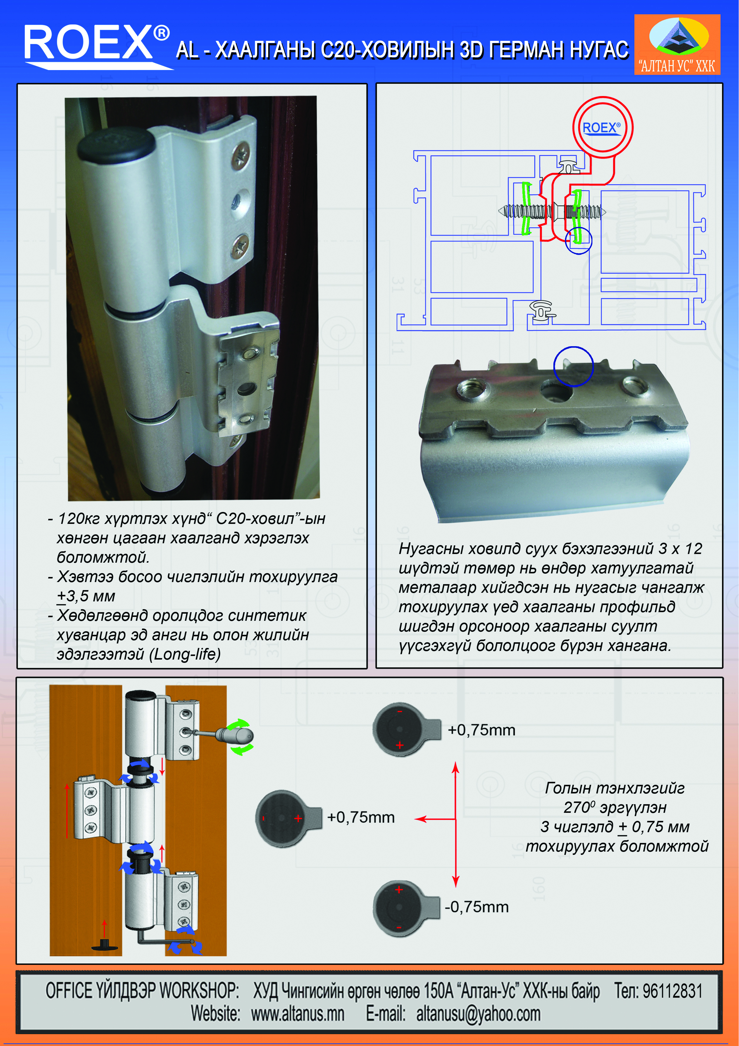 - 120 кг хүртлэх хүнд даацын "С20-ховил"-ын хөнгөн цагаан хаалганд хэрэглэх боломжтой.
