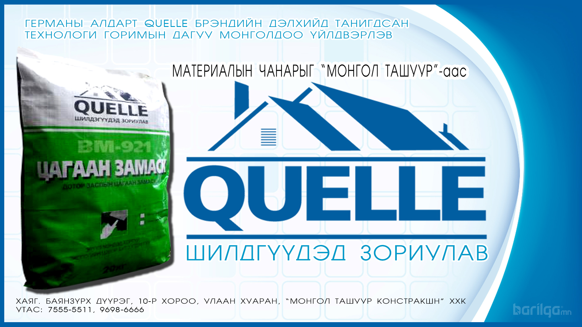 QUELLE брэндийн цагаан замаск нь импортоор орж ирж буй 821 маркийн цагаан замаскны сайжруулсан технологи буюу 921 стандартаар үйлдврлэгдсэн Монголд үйлдвэрлэж буй анхны цагаан замаск юм. Бүтээгдэхүүний найрлага нь байгалийн цэвэр цагаан чулуу, полимер, целлюз агуулдаг бөгөөд хүний биед сөрөг нөлөөгүй, органик бүтээгдэхүүн юм.