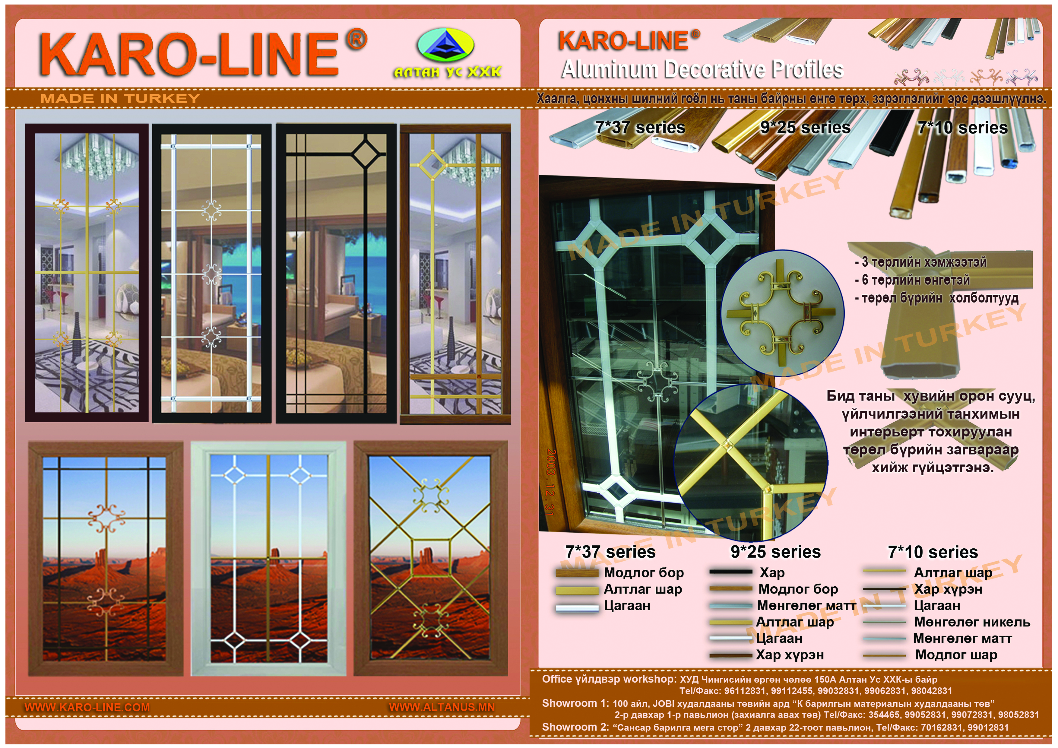 Манай компани нь 1997 оноос эхлэн барилгын металл-хуванцар хаалга цонх, шилэн фасад, интерьер-экстерьер хийх чиглэлээр мэргэшин ажиллаж Нисэх онгоцны төв буудал, Дорнодын цахилгаан станцын өргөтгөл шинэчлэл, ХААН Банк, Оргил худалдааны төв, Ford, Улаанхуаран, Бодь автоматив, Сонсголон зэрэг авто худалдааны төвүүд, Эрэл сургуулийн өргөтгөл, Soho мебель, Голомт Зүүн хүрээ хотхоны шилэн фасадууд зэрэг 400 гаруй обьектод томоохон ажлууд хийж гүйцэтгэсэн болно.
