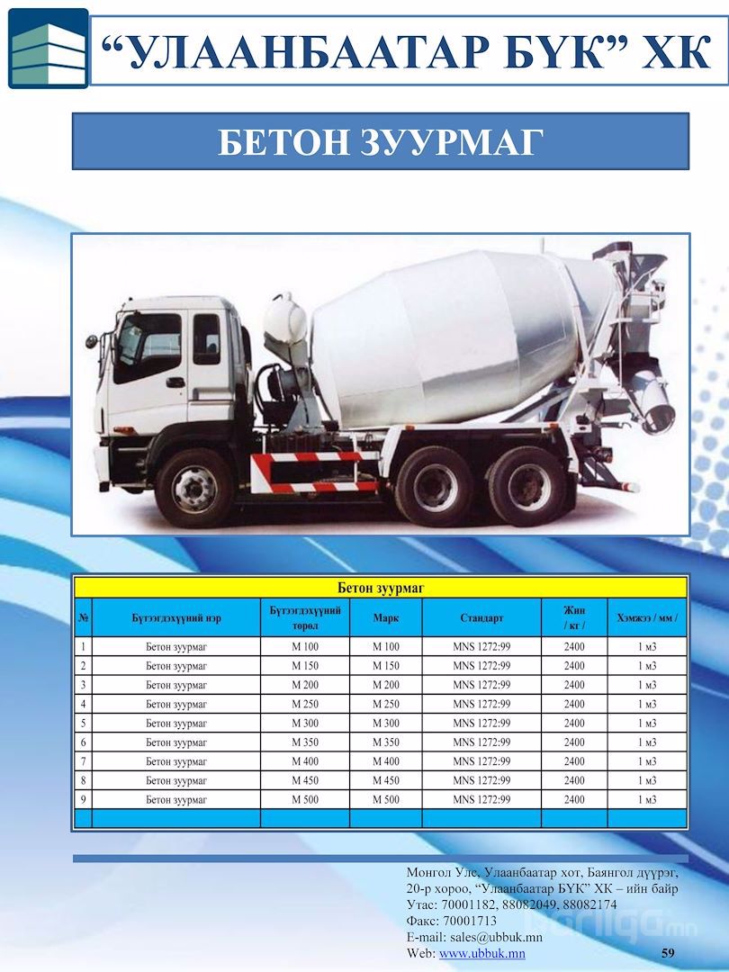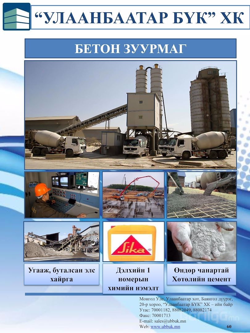 Манай компани нь бетон зуурмаг үйлдвэрлэх 2 зуурмагийн үйлдвэртэй ба 1 үйлдвэр нь цагт 180м3 бетон зуурмаг, нөгөө үйлдвэр нь цагт 120 м3 бетон зуурмаг тус тус үйлдвэрлэх хүчин чадалтахй болно.