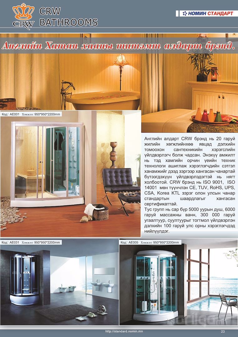 - Английн алдарт CRW брэнд нь 20 гаруй жилийн хөгжлийнхөө явцад дэлхийн томоохон сантехникийн хэрэгслийн үйлдвэрлэгч болж чадсан. Энэхүү амжилт нь тэд хамгийн орчин үеийн техник технологи ашиглаж хэрэглэгчдийн сэтгэл ханамжийг дээд зэргээр хангасан чанартай бүтээгдэхүүн үйлдвэрлэдэгтэй нь нягт холбоотой. CRW брэнд нь ISO9001, ISO14001 чанарын сертификаттай, дэлхийн 100 гаруй улс орны хэрэглэгчдэд нийлүүлэгддэг алдартай брэнд юм.