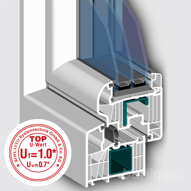 Герман улсын 60 жилийн түүхтэй ROPLASTO үйлдвэрийн ROPLASTO 7001 MD брэндийн хамгийн өндөр чанартай бүтээгдэхүүн юм. Рам нь 80мм өргөнтэй 8 камертай хамгийн сайн цонх юм. Дулаан тусгаарлагч нь 8 камертай дулааныг хамгийн сайн хадгална мөн хүйтнийг нэвтрүүлэхгүй. ISO-9002 олон улсын чанарын стандартыг хангасан. Захиалагчын хүсэлтээр 3 болон 4 давхар шилтэй мөн энгийн болон 2 ажиллагаатай цоож нугастай хийнэ. 60өс градуст үл хөлдөх Турк улсын (EPDM) зөөлөн резинтэй, дулаан хадгалах, дуу тусгаарлах, салхи,ус, агаарын битүүмжлэл сайтай.