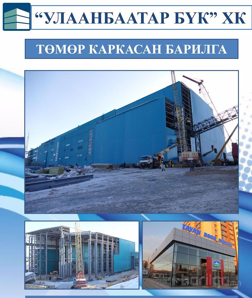 “АПУ” ХК-ийн захиалгын дагуу 117м-ийн урттай, 30м-ийн өргөнтэй, 35м-ийн өндөртэй дундаа баганагүй төмөр каркасан барилгын барилга угсралтын ажил.