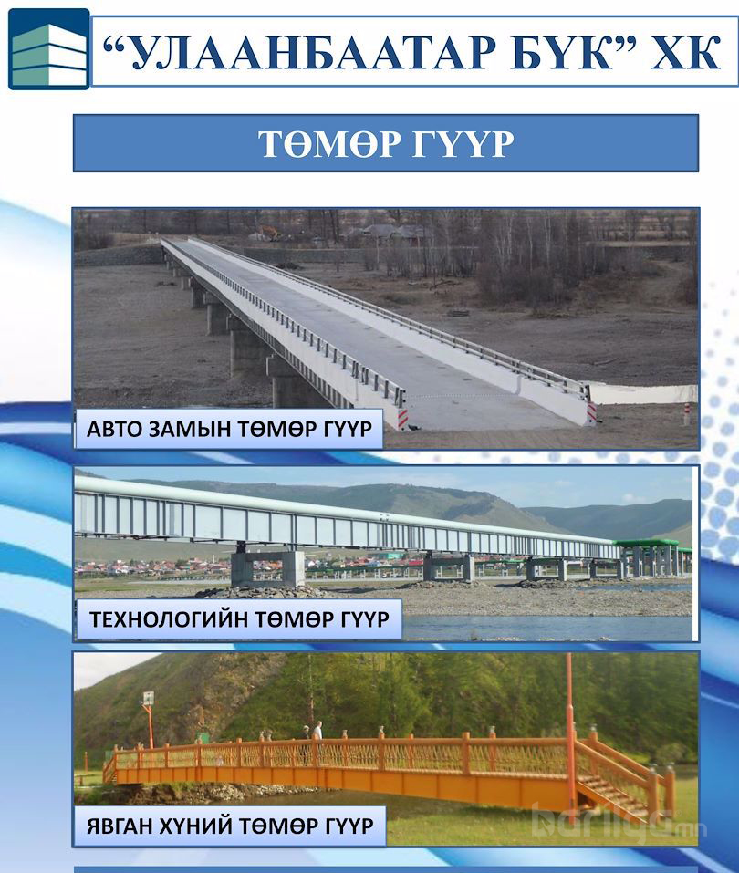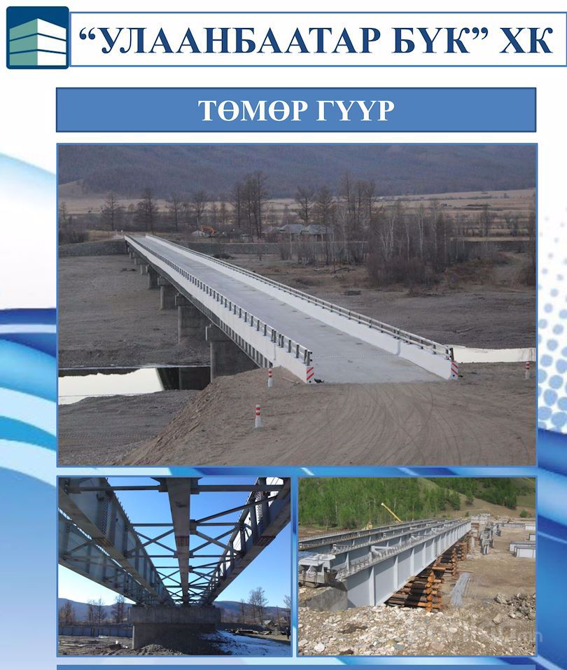 Манай компани нь “Хөвсгөл Зам” ХХК-ийн захиалгаар Монголдоо анх удаа Хөвсгөл аймгийн Цагаан-Үүр суманд 326 метрийн урттай төмөр гүүрний төмөр хийц эдлэлийг үйлдвэрлэн нийлүүлсэн ба энэхүү төмөр гүүрний зураг төсөл, төмөр хийц эдлэл, угсралтыг 100% Монгол инженерүүд хийж гүйцэтгэсэн болно.
