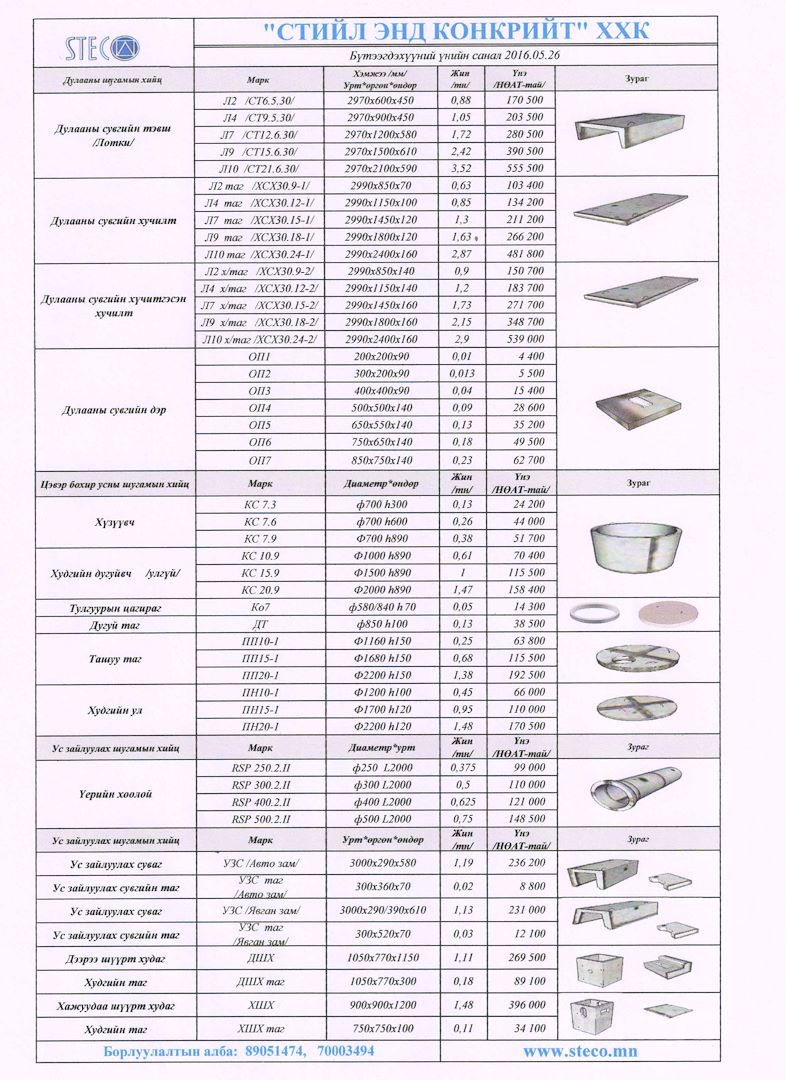 Бүх төрлийн Кольцо-худгийн дугуйвч, худгийн таг, Лотки-дулааны шугамын сувгийн тэвш, дулааны сувгийн хучилт, ОП-сувгийн тулгуур дэр, ус зайлуулах суваг, таг, үерийн усны хоолой, дээрээ болон хажуудаа шүүртэй худаг, таг бетон, Гулсах тулгуур зэрэг бүх бүтээгдэхүүнийг их бага хэмжээгээр нийлүүлнэ.