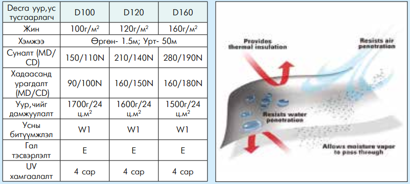 DECRA уур ус тусгаарлагч нь олон бичил сүвтэй, дээд зэргээр амьсгалдаг, 3 үе давхаргатай полипропилен материал юм. Дээд үе нь ус тусгаарлах гадаргуу, дунд үе нь амьсгалдаг ус тусгаарлах мембран, доод үе нь механик гэмтлээс хамгаалсан хүчитгэсэн мембрантай.