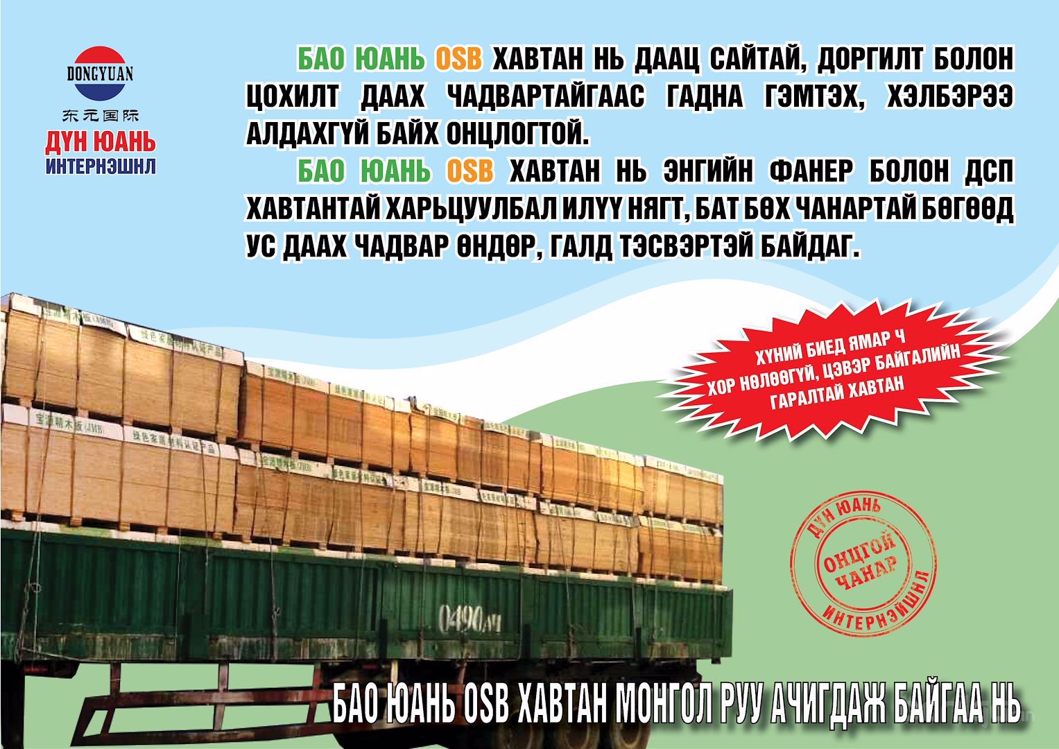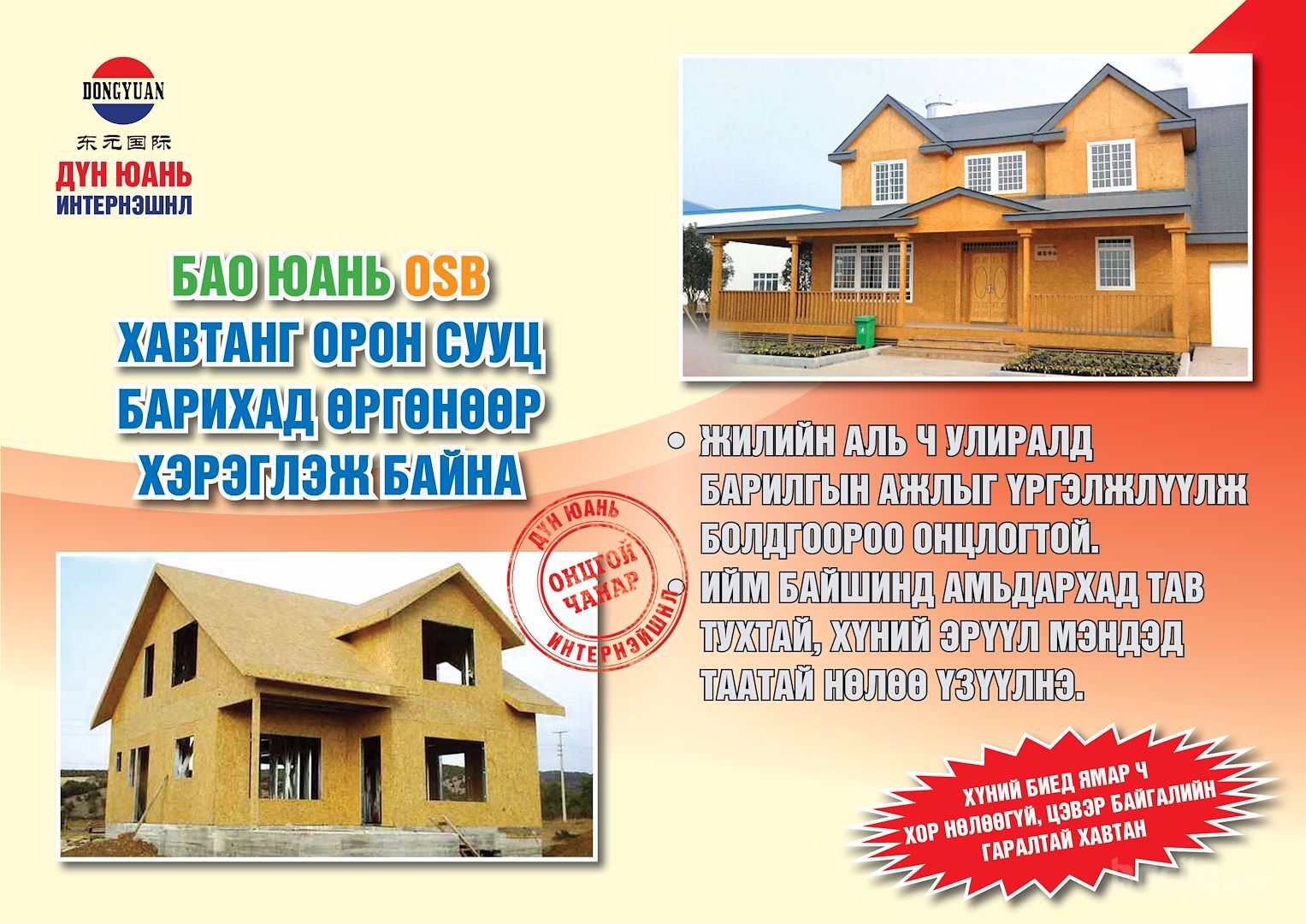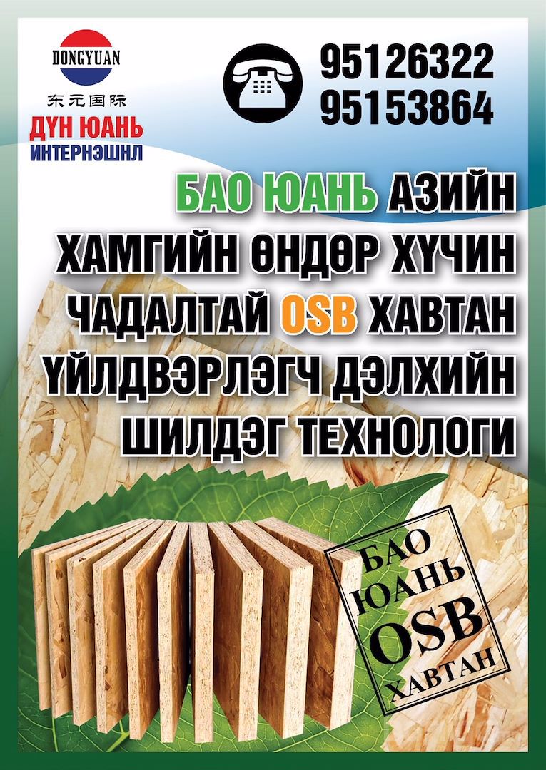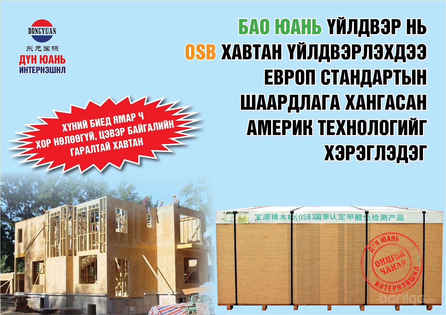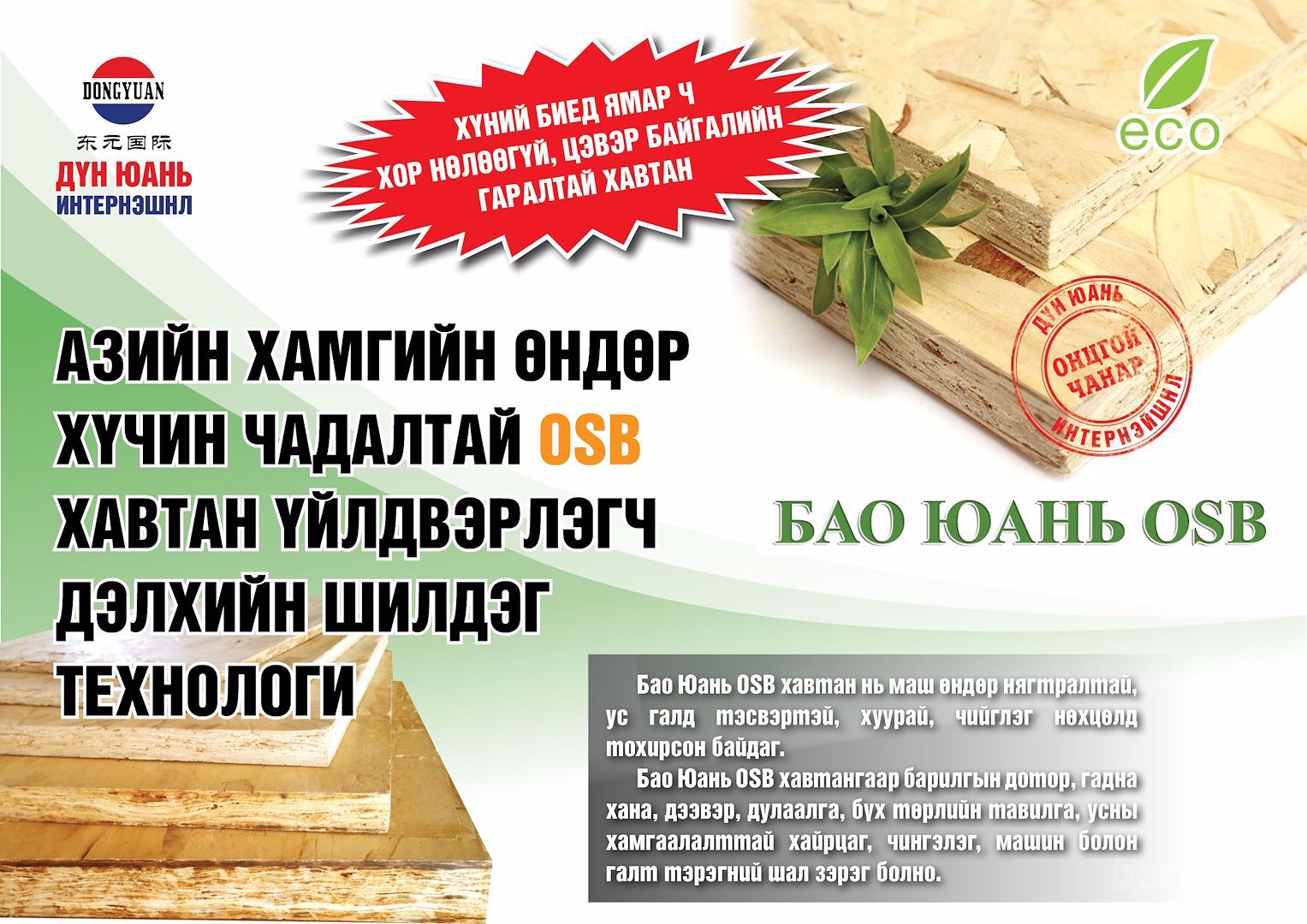 Азийн хамгийн том OSB хавтан үйлдвэрлэгч Бао Юань компани Дэлхийн шилдэг технологиор хийсэн гал, ус, чийгэнд маш сайн тэсвэртэй, даац сайтай, маш өндөр нятралтай, доргилт болон цохилт даах чадвартайгаас гадна гэмтэх хэлбэрээгүй алдахгүй байх онцлогтой, хүний биед болон амьд организмд сөрөг нөлөөгүй, харшил өгөхгүй, америк технологиор хийсэн PMDI сайн чанарын цавуутай