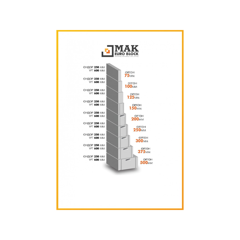 Евроблок нь 400-500кг/м³3 нягттай учраас ердийн бетоноос 5 дахин хөнгөн ба 600 x 400 x 250мм хэмжээтэй стандарт блок нь 100 тн ачаа даах чадвартай.