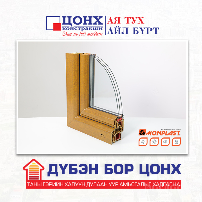 - Цонх нь Монголын анхны массаараа бор өнгөөр үйлдвэрлэгдсэн гадна болон дотор талдаа дүбэн бор хуулгатай цонх юм