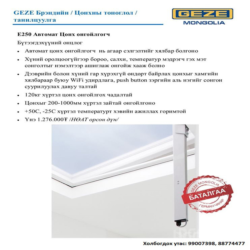 Geze e250 загварын автоматаар цонх онгойлгогч тоноглол