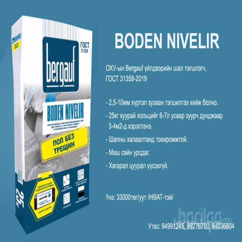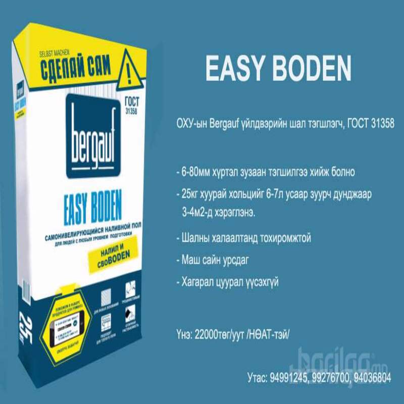 25кг хуурай хольцийг 6-7л усаар зуурч дунджаар 3-4м2-д хэрэглэнэ. 2,5-10мм хүртэл зузаан тэгшилгээ хийж болно. Шалны халаалтанд тохиромжтой. Урсалт сайтай. Хагарал цуурал үүсэхгүй. Үнэ: 33000₮/уут
