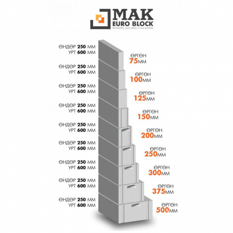 Евроблок нь 400-500кг/м³3 нягттай учраас ердийн бетоноос 5 дахин хөнгөн ба 600 x 400 x 250мм хэмжээтэй стандарт блок нь 100 тн ачаа даах чадвартай.