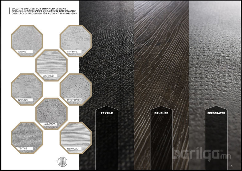 DUO CORE Технологи: Дуу чимээг шингээгч мяндсан сүлжмэл давхрагатай, Алхахад таатай, Хэлбэр хэмжээнд өөрчлөлт орохгүй, 4 мм завсартай плита болон бусад гадаргуу дээр суурилуулж болно.