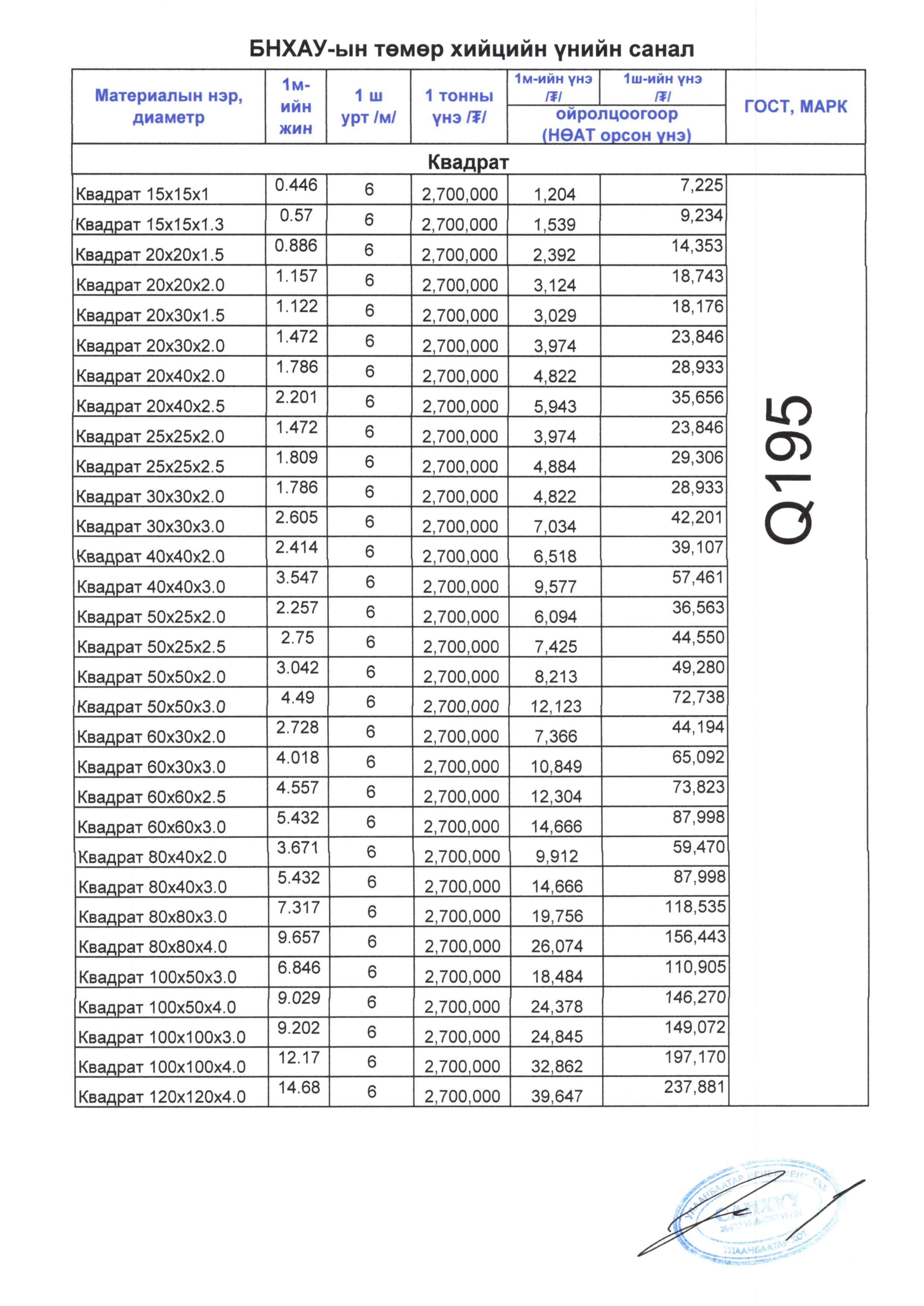 Квадрат / дөрвөлжин хөндий хоолой/ худалдаж байна. Хавсаргасан Үнийн санал 2024 оны 06 сарын 25-ны мэдээлэл тул тухайн материалыг сонирхох үедээ компанийн холбогдох утаснаас тодруулахыг хүсье.
