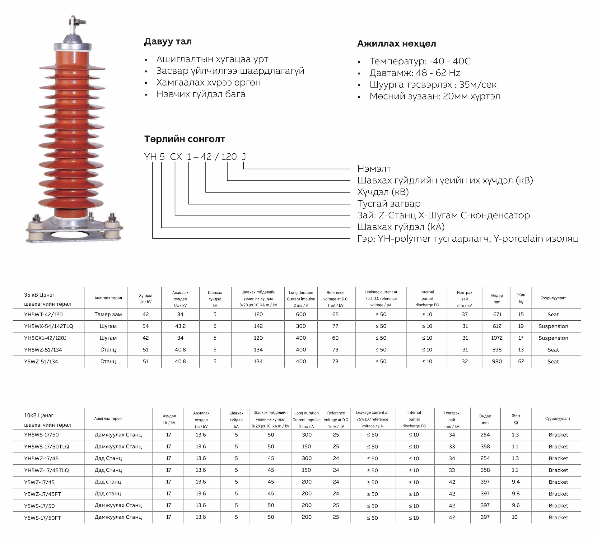 АББ групп нь IEC стандартын дагуу 6кВ, 10кВ, 35кВ, 110кВ, 220кВ-ийн хүчдэлийн түвшинд тавигдах байрлал бүрт тохирсон үзүүлэлттэйгээр үйлдвэрлэдэг. Цэнэг шавхагчийн тавигдах байрлал бүрт (трансформатор, кабель, шугам гм) тохирох үзүүлэлтийг бий сонгосноор шаардлагатай үед, найдвартай ажиллах боломжийг бүрдүүлнэ.