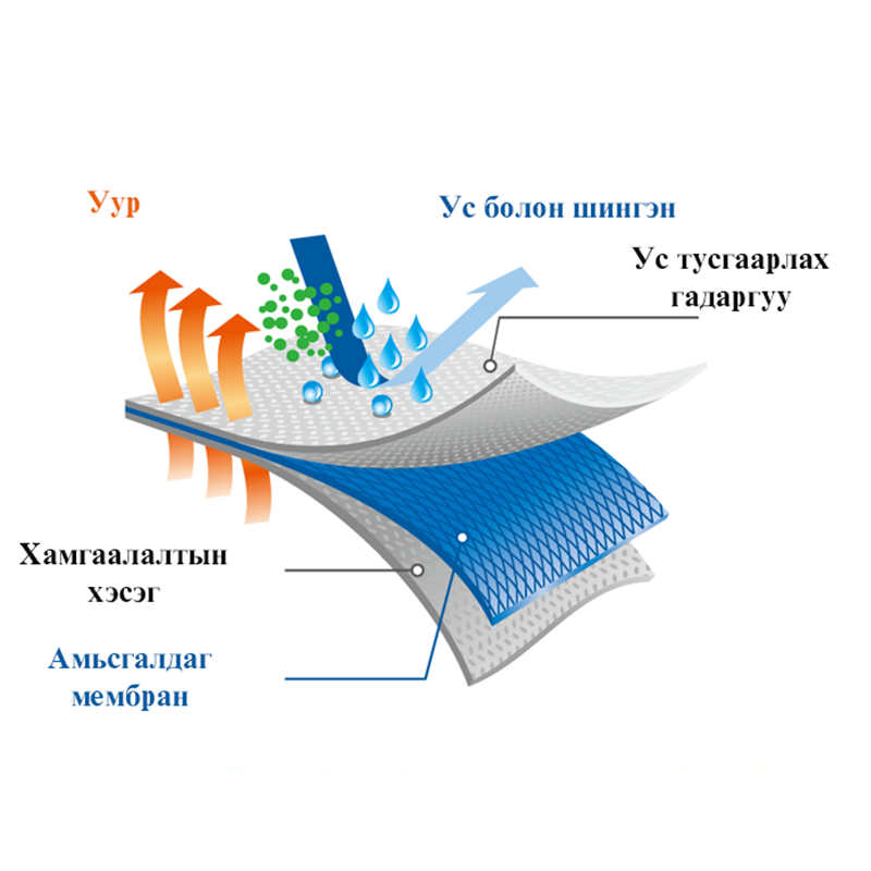 Дээд үе нь ус тусгаарлах гадаргуу, дунд үе нь амьсгалдаг ус тусгаарлах мембран, доод үе нь механик гэмтлээс хамгаалсан хүчитгэсэн мембрантай.