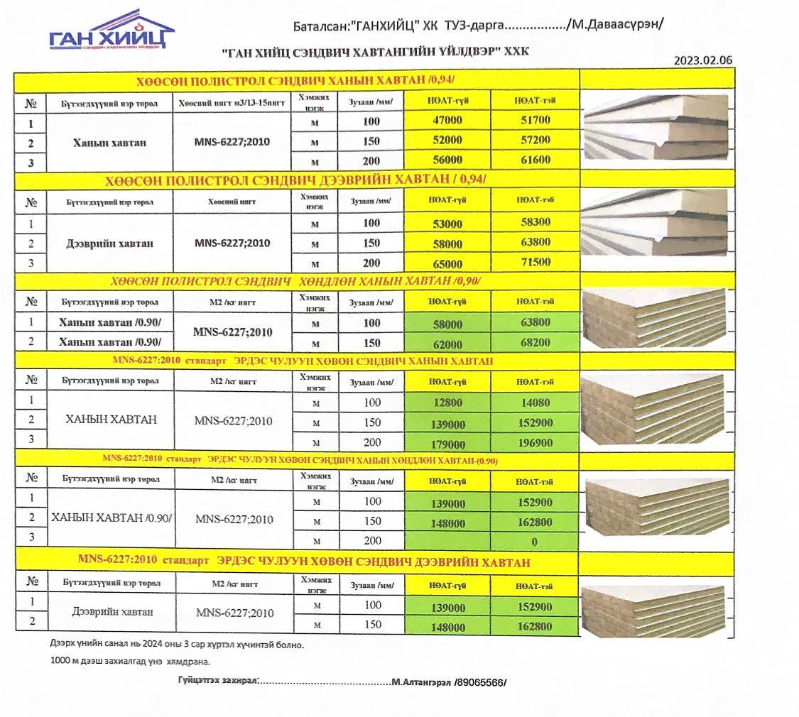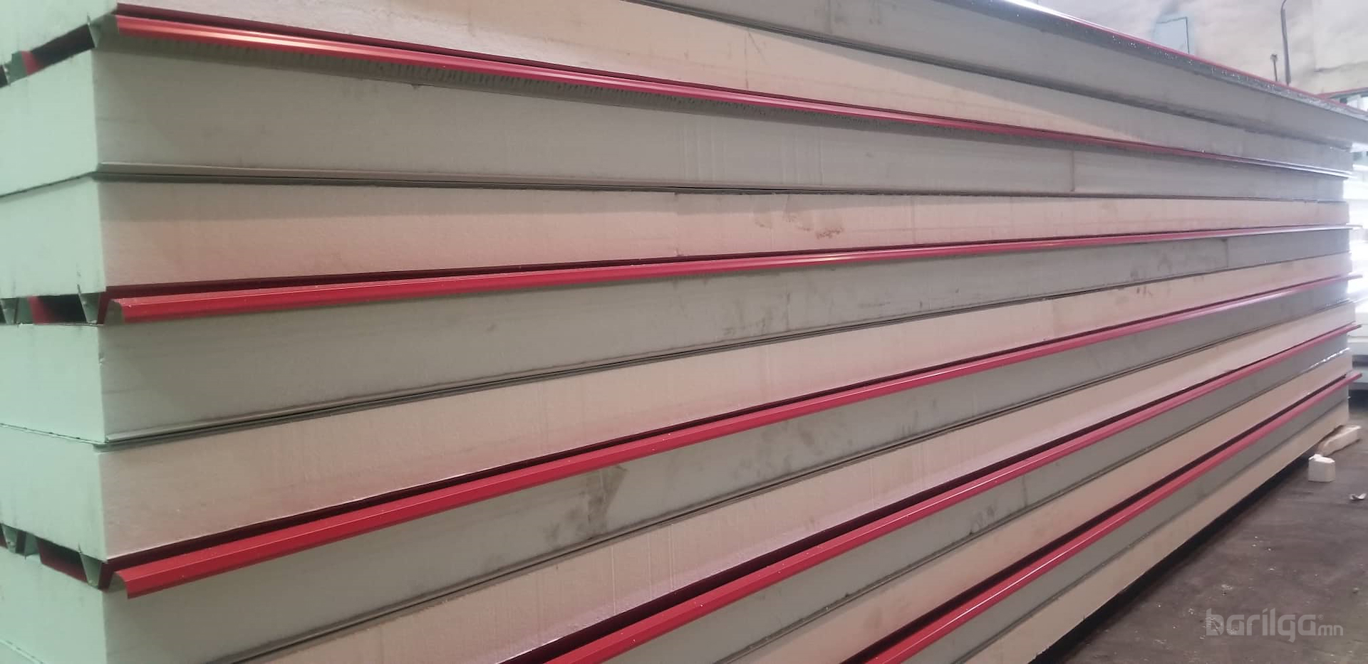 Галд дэмждэггүй хөөсөн полистролоор үйлдвэрлэсэн 100мм зузаантай дотор ханын төмөр 0.4мм, гадна ханын төмөр 0,42мм болно.