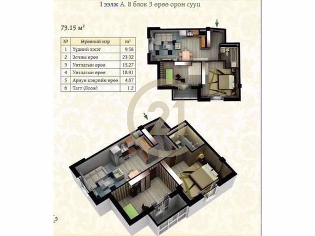 Нийт 3 өрөө 73мкв: 1 зочны өрөө2 унтлагын өрөө, 1 ариун цэврийн өрөө
