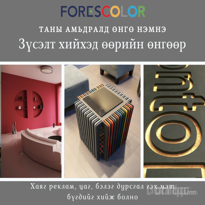 Гэр, дэлгүүр, оффис гээд бүх газрын дотор засал чимэглэлд өнгө нэмнэ.
