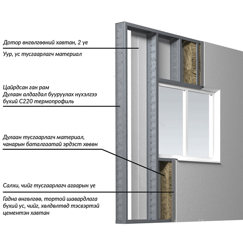 Барилгын үндсэн каркасд (бетон, металл) цайрдсан ган рамтай дулаалгын үе бүхий ханын хавтанг фасадны хавтан хэлбэрээр ашиглана.