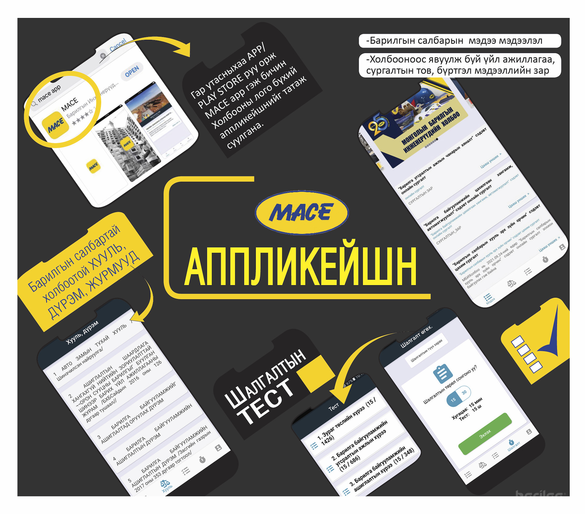 - Гар утасныхаа APP/PLAY STORE руу орж MACE app гэж бичин Холбооны лого бүхий аппликэйшнийг ҮНЭГҮЙ татаж суулгана.