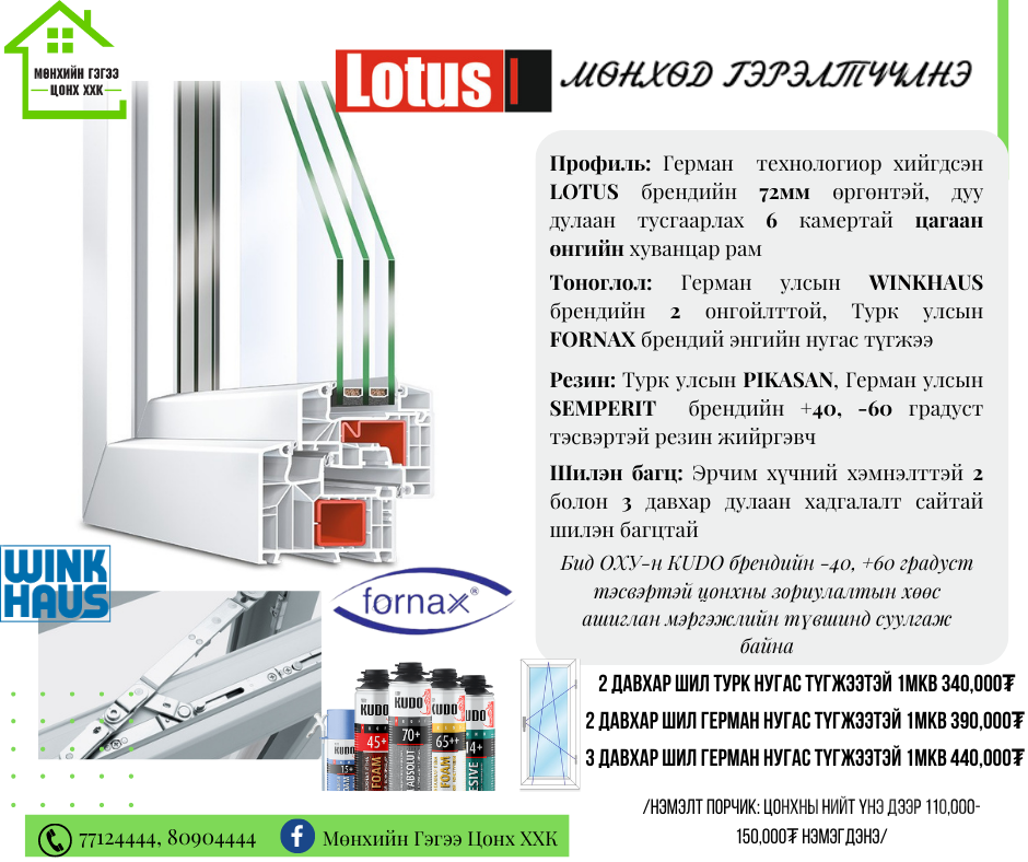Герман технологиор хийгдсэн LOTUS брендийн 72мм өргөнтэй, дуу дулаан тусгаарлах 6 камертай цагаан өнгийн хуванцар рам, Герман улсын WINKHAUS брендийн 2 онгойлттой, Турк улсын FORNAX брендий энгийн нугас түгжээ Турк улсын PIKASAN, Герман улсын SEMPERIT брендийн +40, -60 градуст тэсвэртэй резин жийргэвч , Эрчим хүчний хэмнэлттэй 2 болон 3 давхар дулаан хадгалалт сайтай шилэн багцтай
