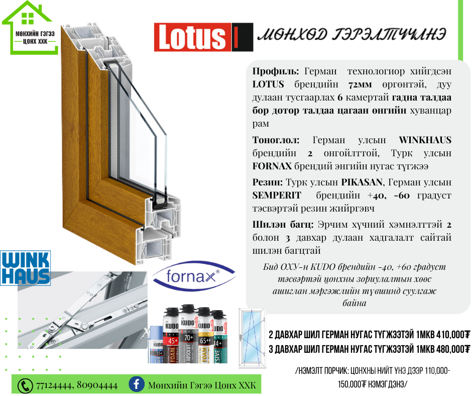 Герман технологиор хийгдсэн LOTUS брендийн 72мм өргөнтэй, дуу дулаан тусгаарлах 6 камертай гадна талдаа бор дотор талдаа цагаан өнгийн хуванцар рам, Герман улсын WINKHAUS брендийн 2 онгойлттой, Турк улсын FORNAX брендий энгийн нугас түгжээ, Турк улсын PIKASAN, Герман улсын SEMPERIT брендийн +40, -60 градуст тэсвэртэй резин жийргэвч, Эрчим хүчний хэмнэлттэй 2 болон 3 давхар дулаан хадгалалт сайтай шилэн багцтай
