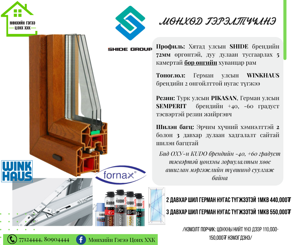 Хятад улсын SHIDE брендийн 72мм өргөнтэй, дуу дулаан тусгаарлах 5 камертай бор өнгийн хуванцар рам, Герман улсын WINKHAUS брендийн 2 онгойлттой, Турк улсын FORNAX брендий энгийн нугас түгжээ Турк улсын PIKASAN, Герман улсын SEMPERIT брендийн +40, -60 градуст тэсвэртэй резин жийргэвч , Эрчим хүчний хэмнэлттэй 2 болон 3 давхар дулаан хадгалалт сайтай шилэн багцтай