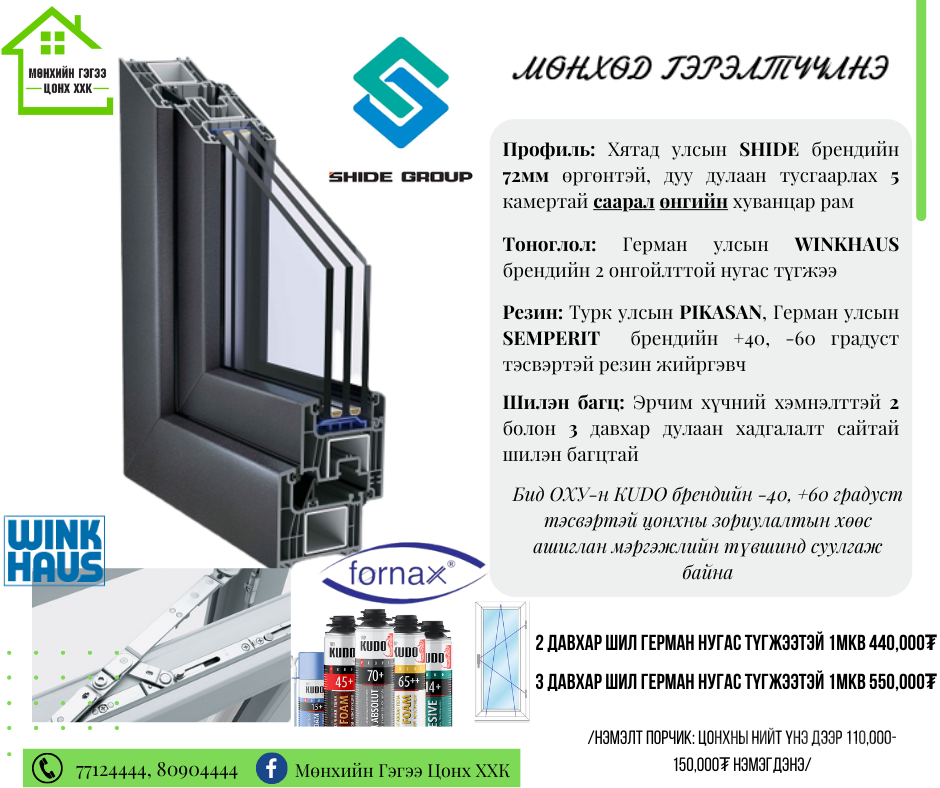 Хятад улсын SHIDE брендийн 72мм өргөнтэй, дуу дулаан тусгаарлах 5 камертай саарал өнгийн хуванцар рам, Герман улсын WINKHAUS брендийн 2 онгойлттой, Турк улсын FORNAX брендий энгийн нугас түгжээ Турк улсын PIKASAN, Герман улсын SEMPERIT брендийн +40, -60 градуст тэсвэртэй резин жийргэвч , Эрчим хүчний хэмнэлттэй 2 болон 3 давхар дулаан хадгалалт сайтай шилэн багцтай