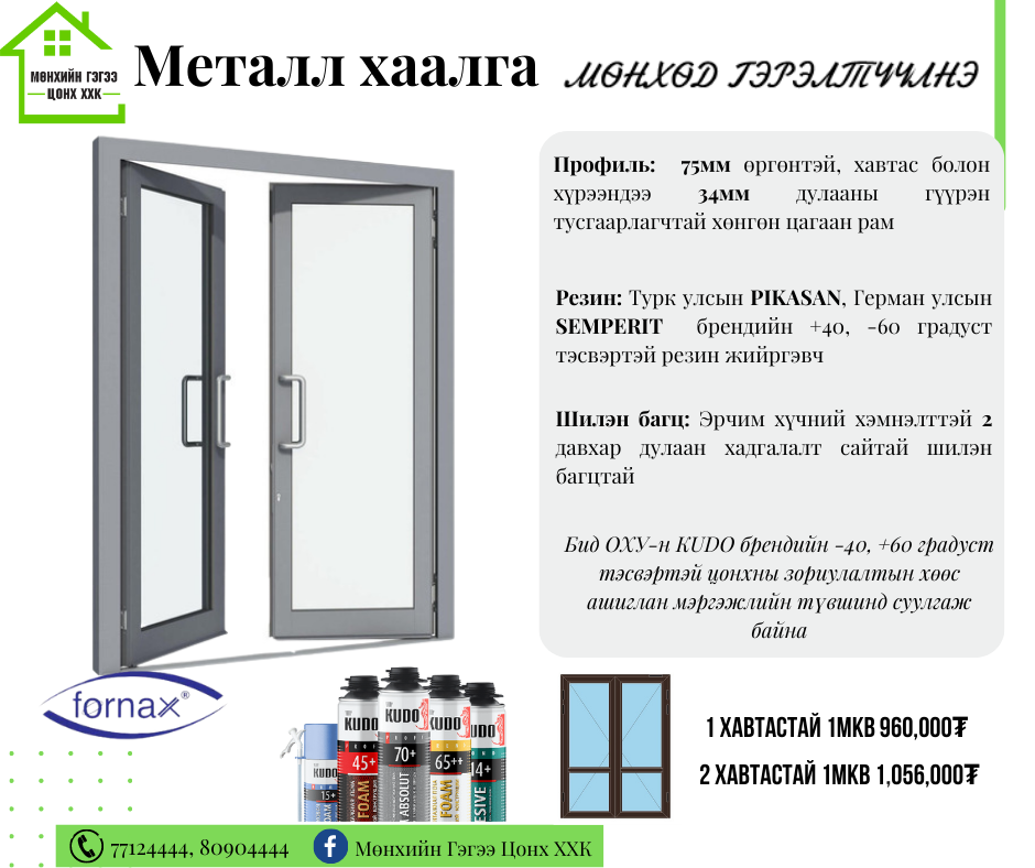 Профиль: 60мм өргөнтэй, хавтас болон хүрээндээ 34мм дулааны гүүрэн тусгаарлагчтай хөнгөн цагаан рам