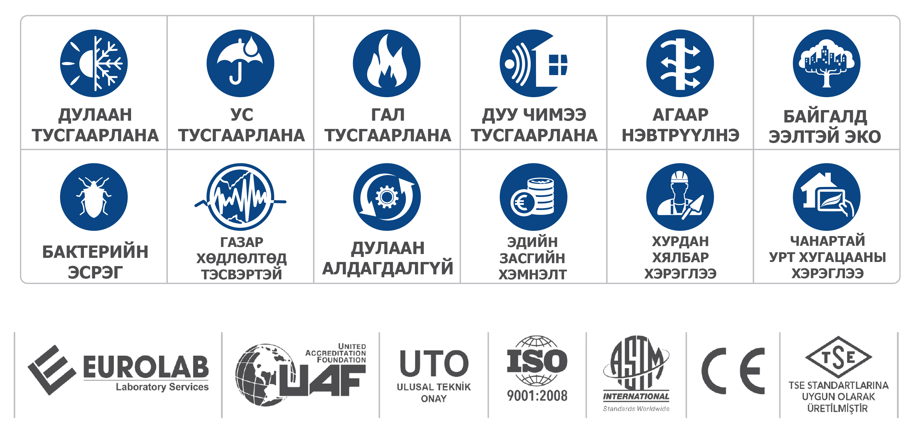 Ус-материалын харьцаа 6-6,5л ус/25кг Онолын хэрэглээ 2,4-2,8кг/м2/см Галд тэсвэрлэх чанар А1, ШҮ