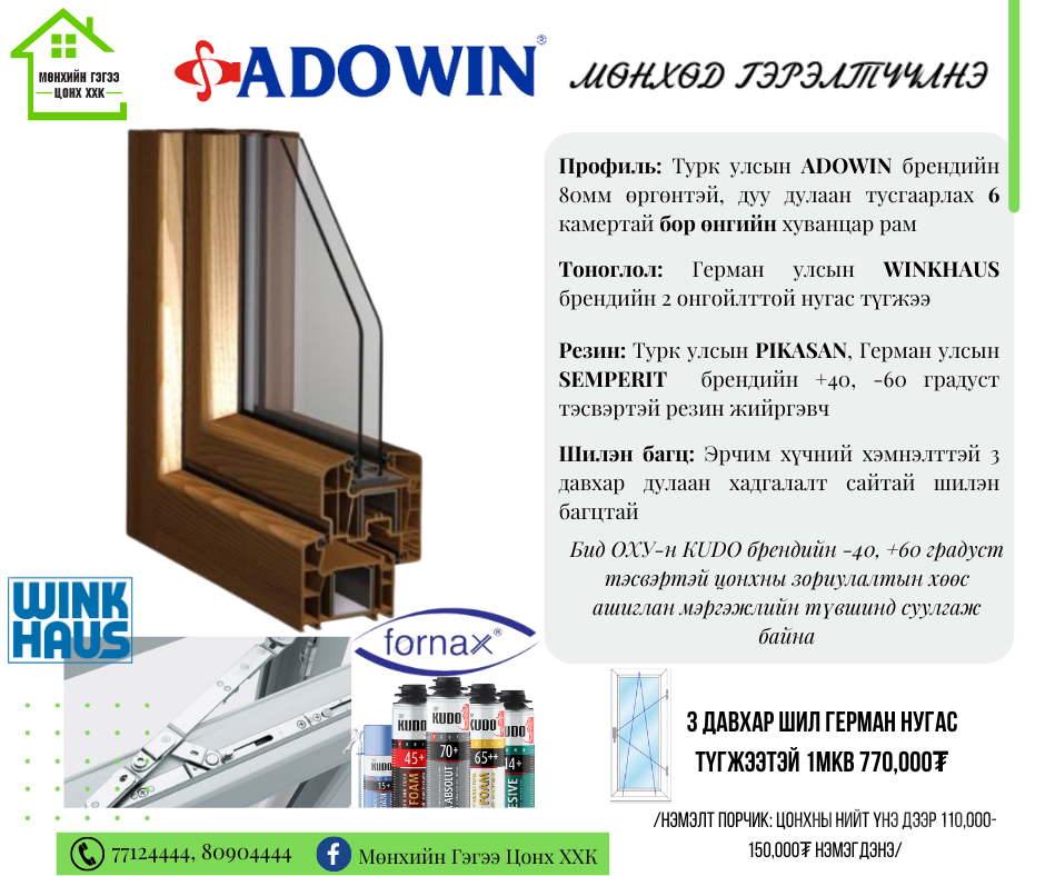 Герман улсын ADOWIN брендийн 80мм өргөнтэй, дуу дулаан тусгаарлах 6 камертай хуванцар рам, Герман улсын WINKHAUS брендийн 2 онгойлттой, Турк улсын FORNAX брендий энгийн нугас түгжээ Турк улсын PIKASAN, Герман улсын SEMPERIT брендийн +40, -60 градуст тэсвэртэй резин жийргэвч , Эрчим хүчний хэмнэлттэй 2 болон 3 давхар дулаан хадгалалт сайтай шилэн багцтай
