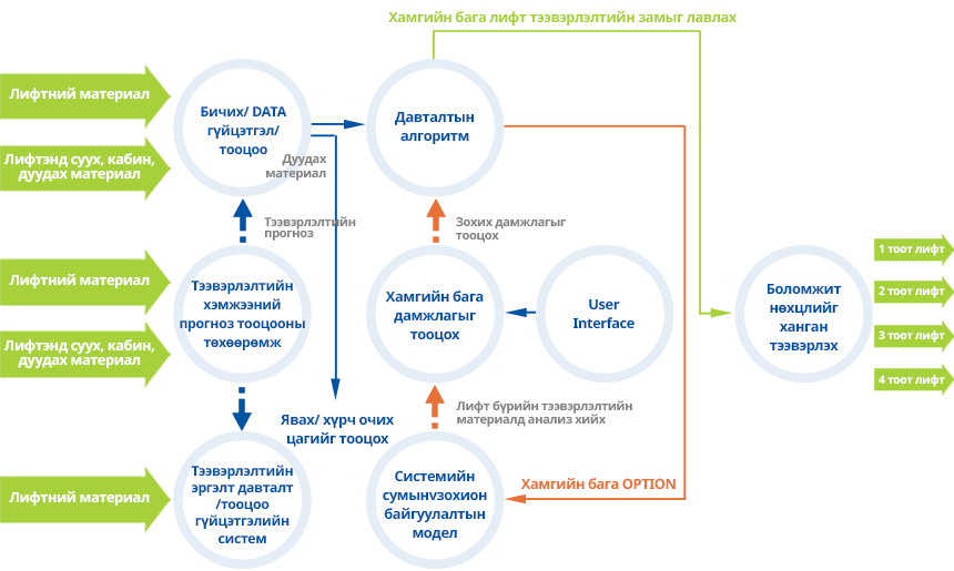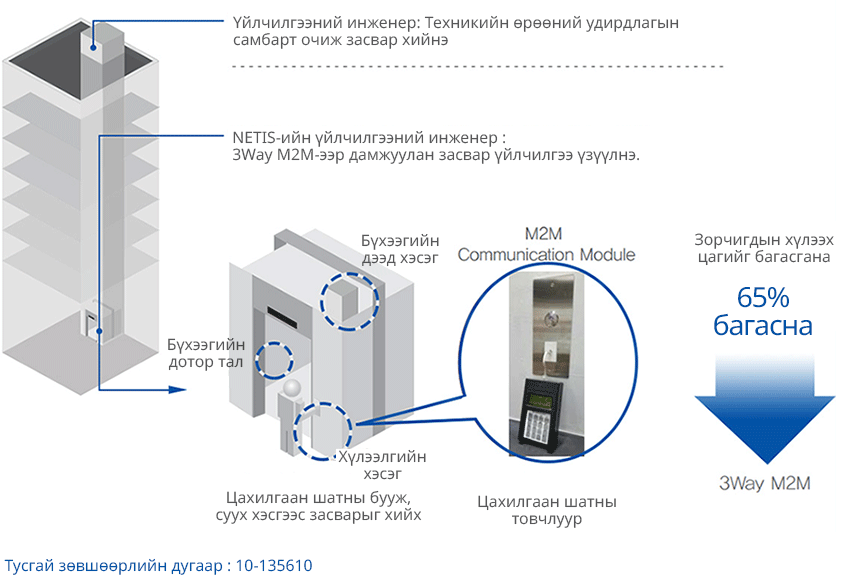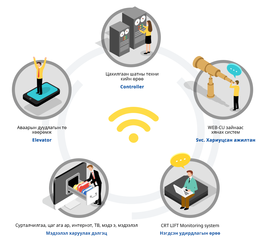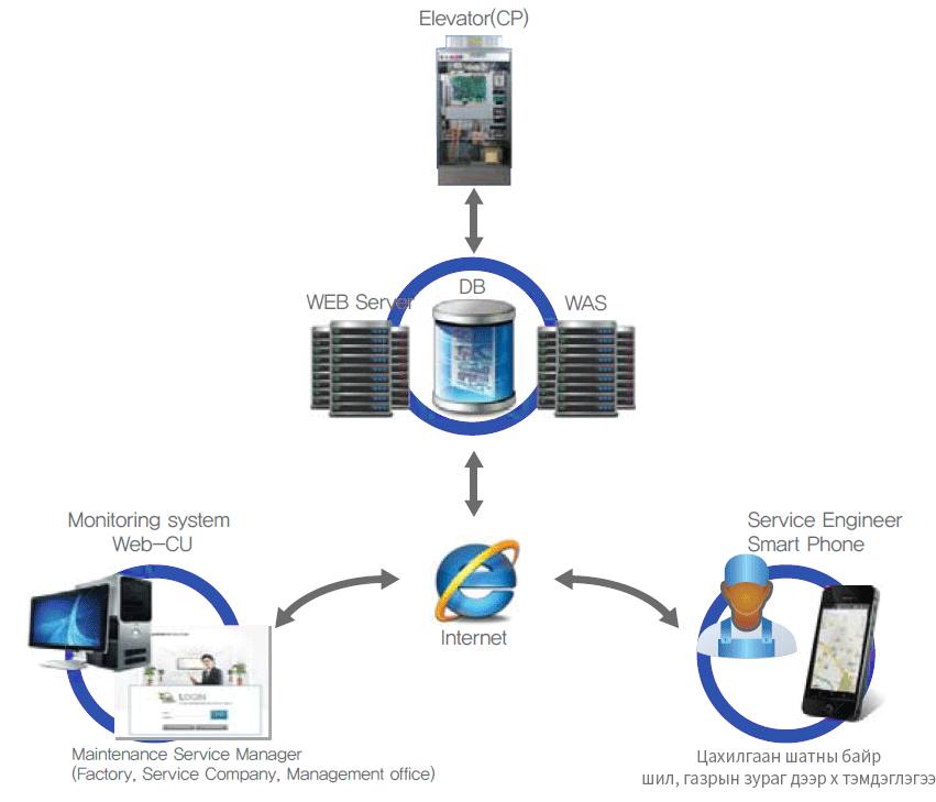 Цахилгаан шатны байдлыг вэб серверт илгээж мэдээллийн санд мэдээллийг хадгалах ба гарсан доголдлыг интернэтээр холбогдон үйлчилгээний инженерт байрлал болон нөхцөл байдлын мэдээллийг цаг тутамд илгээнэ.