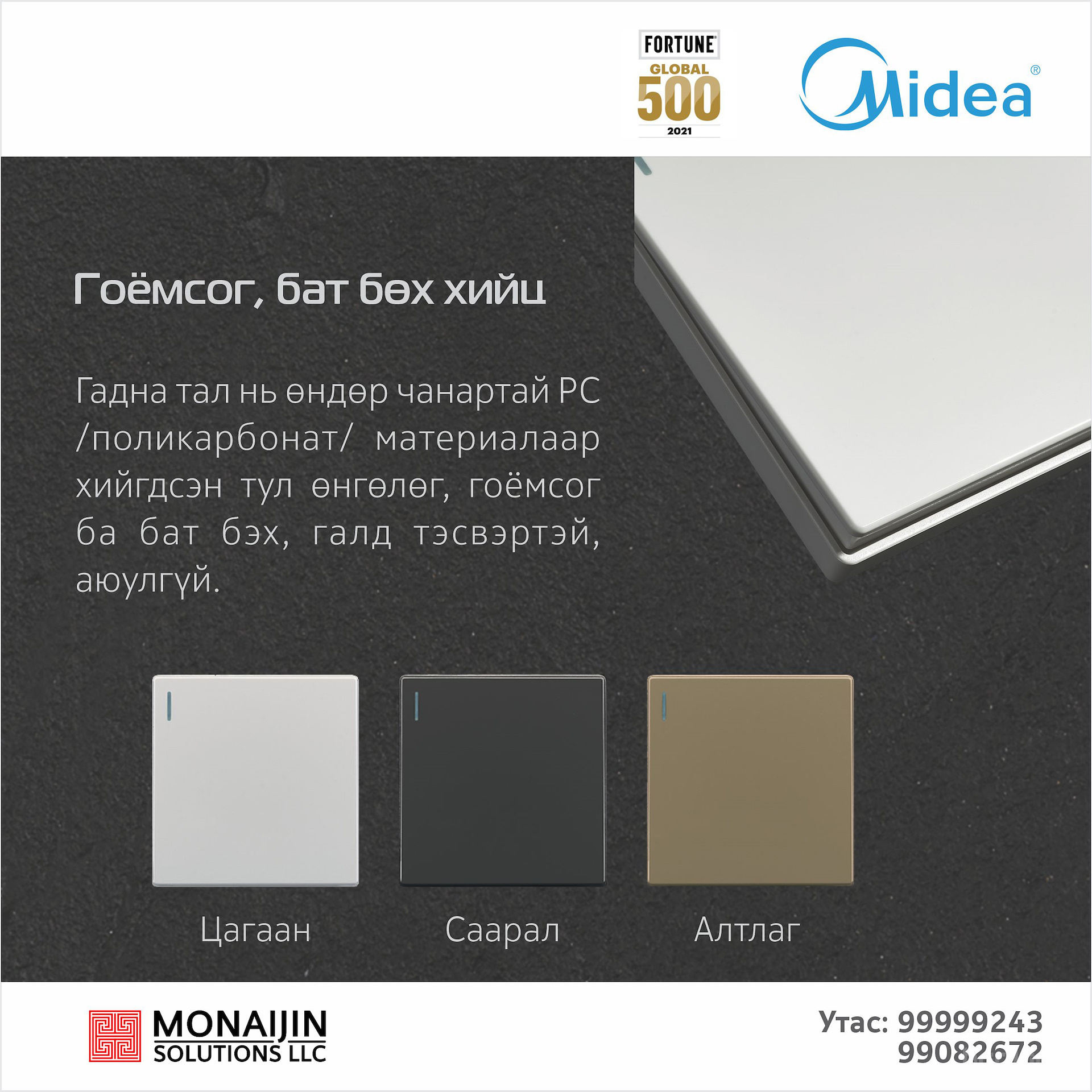 Цагаан, алтлаг, саарал гэсэн 3-н төрлийн өнгөний сонголттой. /Төсөлд зориулж бусад нэмэлт өнгөөр нийлүүлэх боломжтой/