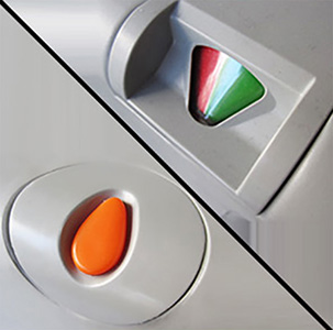 3. Шар товлуур дээр зөөлөн дарж бохирын савныг хийг гаргана. Улаан, ногоон өнгөтэй заагч бохирын сав дүүрсэн эсэхийг зааж байна. Улаан- бохирын дүүрсэн гэсэн үг.