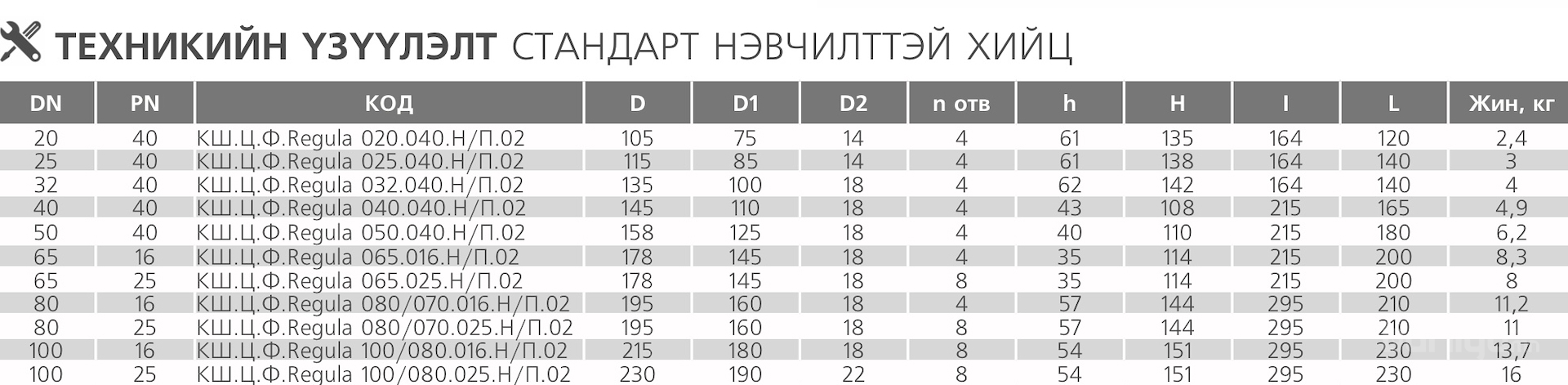 - Бөмбөлөг: зэврэлтэнд тэсвэртэй ган DN40-65:AISI 304, DN80-300:AISI 409