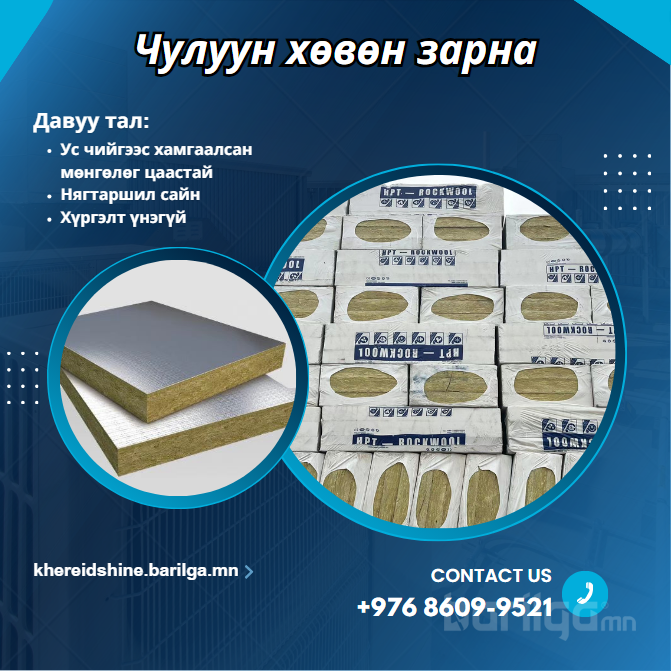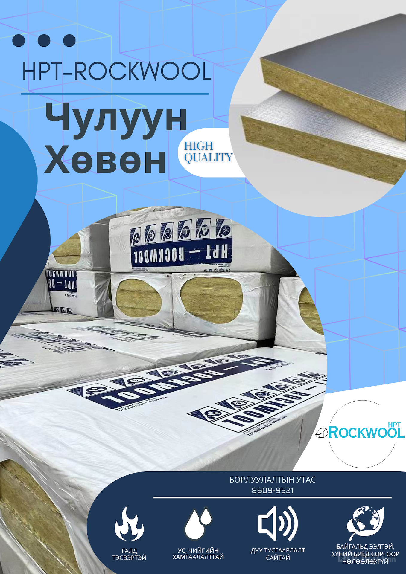 HPT ROCKWOOL ЧУЛУУН ХӨВӨН нь 80кг нягтаршилтай, 5см,1м2- үнэ-12,750, Боодол- 55,080  10см зузаантай, 1м2- үнэ-25,500, Боодол- 55,080  1м3- үнэ- 255,000 , 100кг   нягтаршилтай, 5см, м2- үнэ-13,200, 1м3- үнэ- 264,000,  Боодол- 57,024 10см, м2- үнэ-26,400 1м3- үнэ- 264,000,  Боодол- 57,024, 100кг   нягтаршилтай мөнгөлөг цаастай 5см,1м2- үнэ-14,125, Боодол- 61,020, 10см зузаантай, 1м2- үнэ-28,250, Боодол- 61,020  1м3- үнэ- 282,500, 120кг   нягтаршилтай мөнгөлөг цаастай 5см,1м2- үнэ-18,530, Боодол- 80,050, 10см зузаантай, 1м2- үнэ-37,060, Боодол- 80,050  1м3- үнэ- 370,600 . Базальт буюу галт уулын дэлбэрэлтээс үүссэн чулуугаар хийгддэг бөгөөд гадна хананы дулаалгын материал үйлдвэрлэх хамгийн сайн чанартай түүхий эд болж байгаа юм.