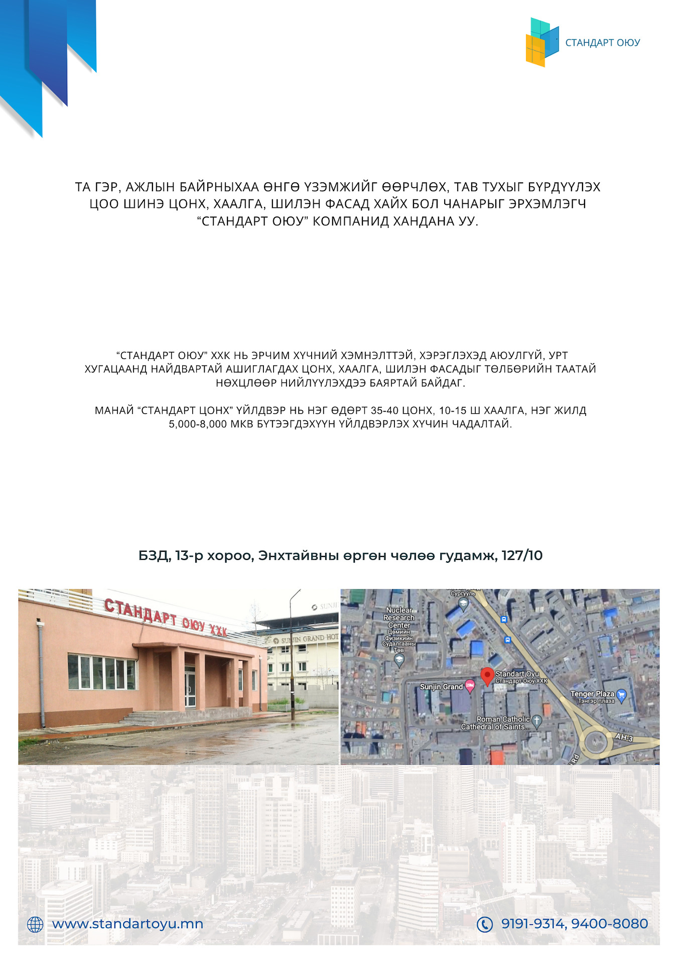 Та гэр, ажлын байрныхаа өнгө үзэмжийг өөрчлөх, тав тухыг бүрдүүлэх цоо шинэ цонх, хаалга, шилэн фасад хайхаар бол чанарыг эрхэмлэгч “Стандарт оюу” компанид хандаарай.