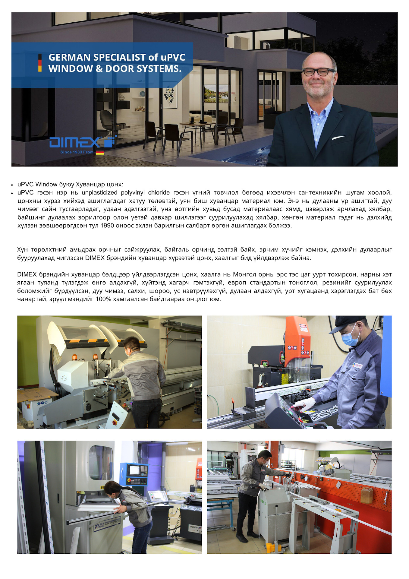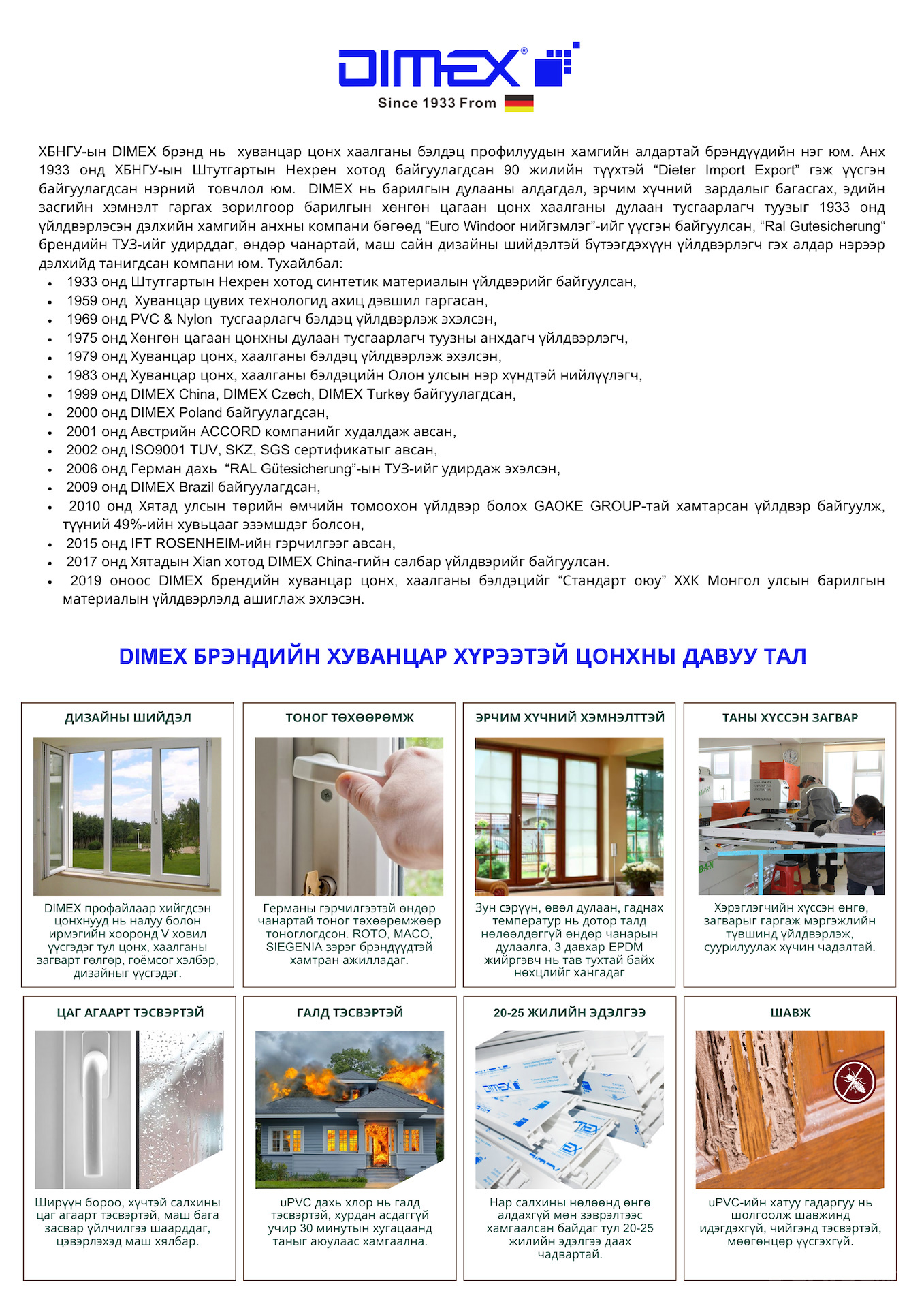 DIMEX брэндийн хуванцар бэлдцээр үйлдвэрлэгдсэн цонх, хаалга нь Монгол орны эрс тэс цаг уурт тохирсон, нарны хэт ягаан туяанд өнгө алдахгүй, хүйтэнд хагарч гэмтэхгүй, европ стандартын тоноглол, 3 давхар резинийг суурилуулах боломжийг бүрдүүлсэн, дуу чимээ, салхи, шороо, ус нэвтрүүлэхгүй, дулаан алдахгүй, урт хугацаанд хэрэглэгдэх бат бөх чанартай, эрүүл мэндийг 100% хамгаалсан байдгаараа онцлог юм.