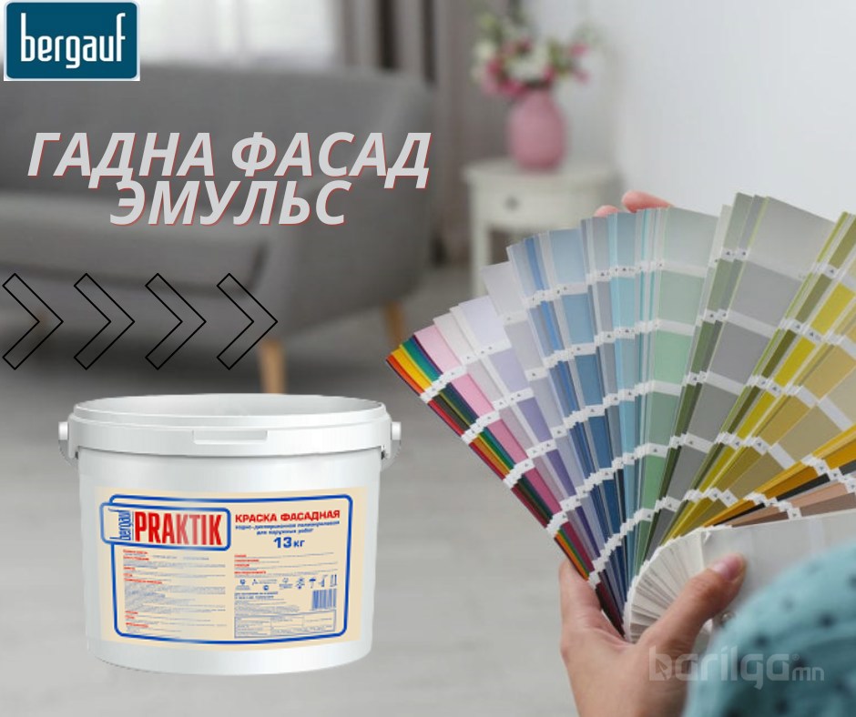 - Орон сууц, оффисын барилгын фасадыг будахад зориулагдсан. Будгийг тоосго, бетон, асбест цемент, гипс, өмнө нь