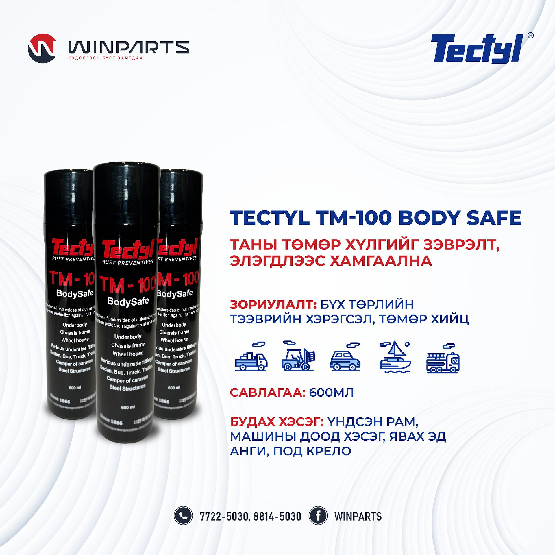 АНУ-ын Тектил брэндийн Tectyl 121B Зэврэлтээс хамгаалах будагч түрхлэг нь бүх төрлийн машин, механизм, тээврийн хэрэгсэл, метал хийцийг зэврэлт, элэгдлээс хамгаална. Дэлхийн авто машин үйлдвэрлэгч тэргүүлэх брендүүд болох Benz, BMW, Rolls Royce, GM, Ford, Toyota, Nissan, Mazda, Hyundai, Kia, Volvo, Fiat, Peugeot, Renault болон Proton зэргийн үйлдвэрлэлд ашиглах албан ёсны зөврөөлөлтэй бүтээгдэхүүн юм.