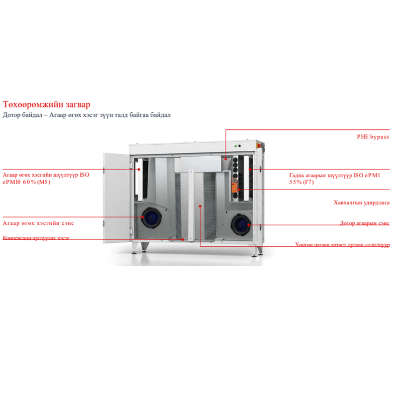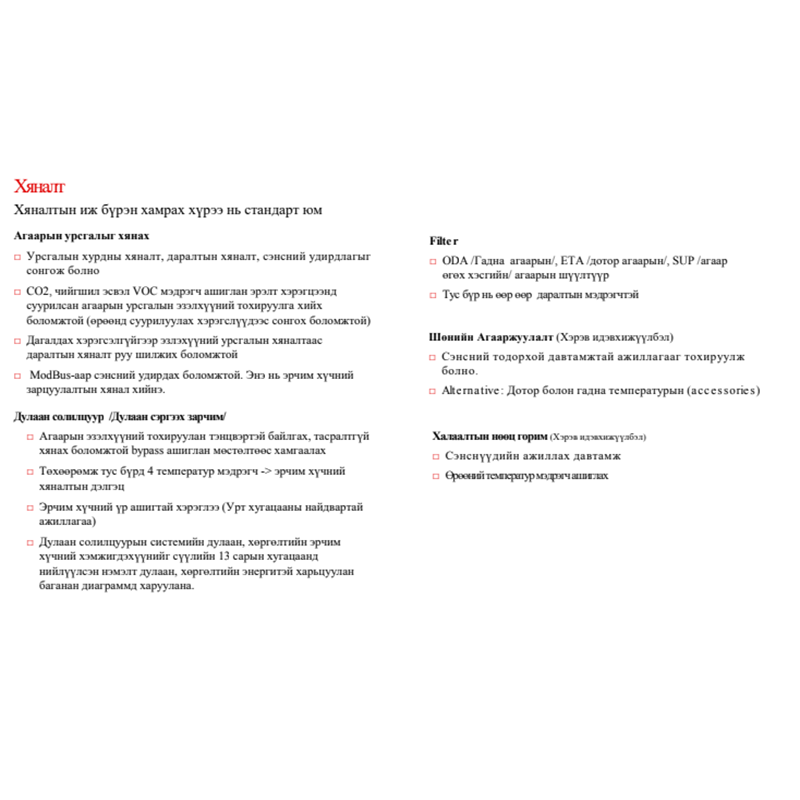 − Эмнэлэгийн мэс заслын өрөө гэх мэт 800 м 3/ц хүртэл агаарын урсгалтай 150-300 м2 хүртэлх талбайтай бүхий л газрын амьсгалах агаарын чанарыг шийднэ.