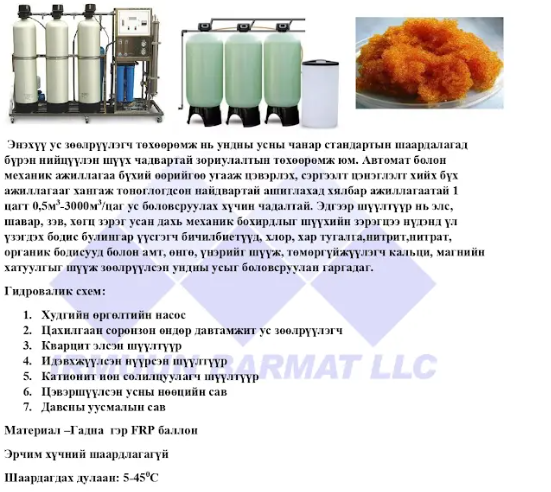 Ус зөөлрүүлэгч цэвэрлэх төхөөрөмж