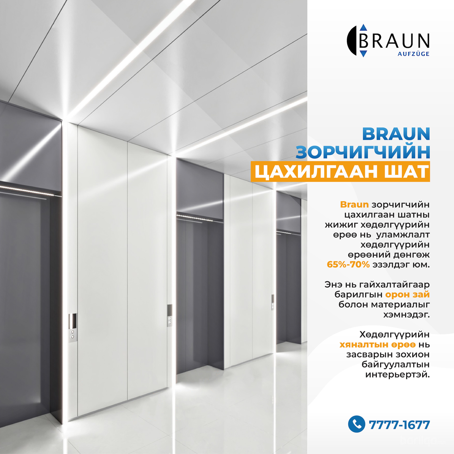 Braun зорчигчийн цахилгаан шатны жижиг хөдөлгүүрийн өрөө нь уламжлалт хөдөлгүүрийн өрөөний дөнгөж 65%-70% эзэлдэг юм. Энэ нь гайхалтайгаар барилгын орон зай болон материалыг хэмнэдэг. Хөдөлгүүрийн хяналтын өрөө нь засварын зохион байгуулалтын интерьертэй.