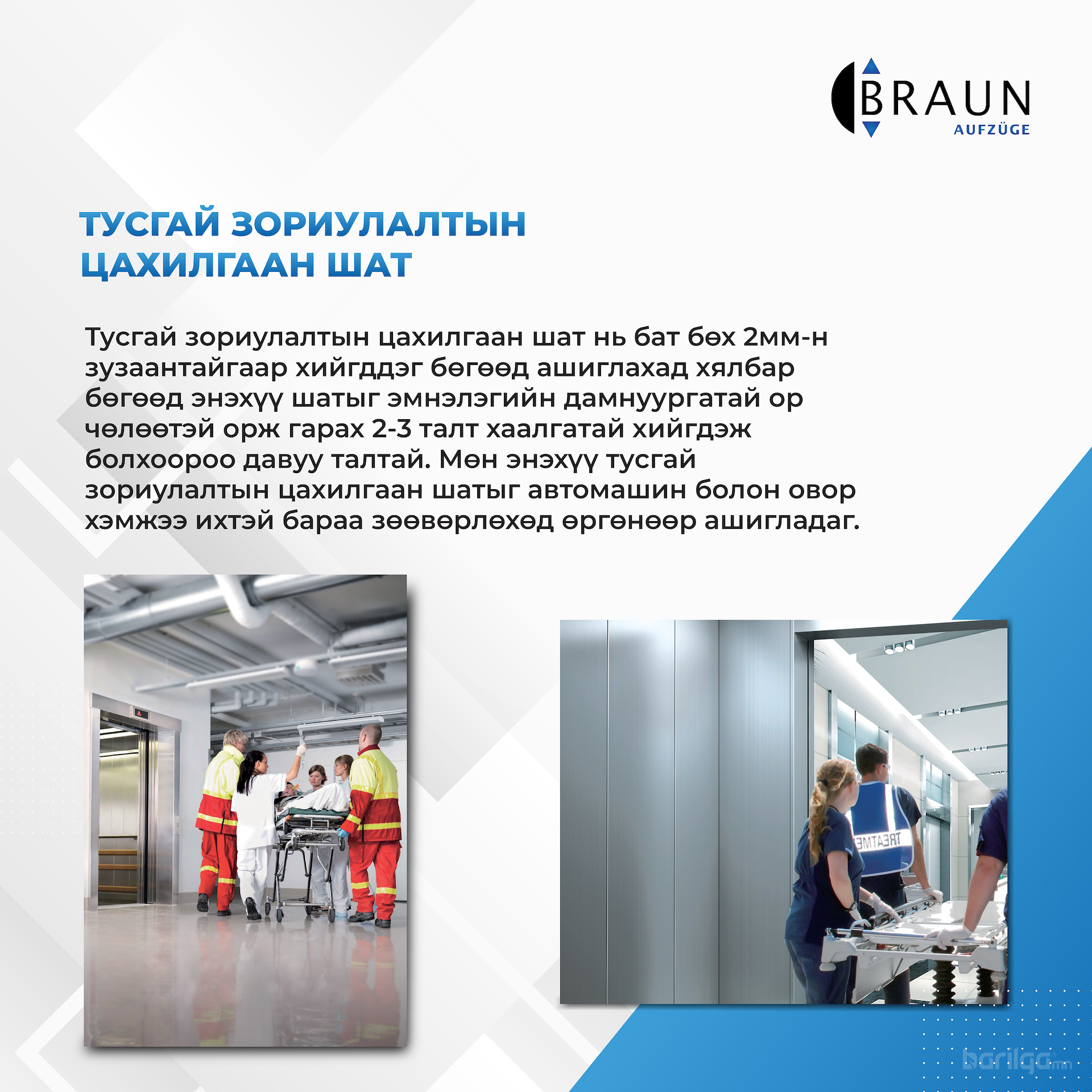 Тусгай зориулалтын цахилгаан шат нь бат бөх 2мм-н зузаантайгаар хийгддэг бөгөөд ашиглахад хялбар бөгөөд энэхүү шатыг эмнэлэгийн дамнуургатай ор чөлөөтэй орж гарах 2-3 талт хаалгатай хийгдэж болхоороо давуу талтай. Мөн энэхүү тусгай зориулалтын цахилгаан шатыг автомашин болон овор хэмжээ ихтэй бараа зөөвөрлөхөд өргөнөөр ашигладаг.