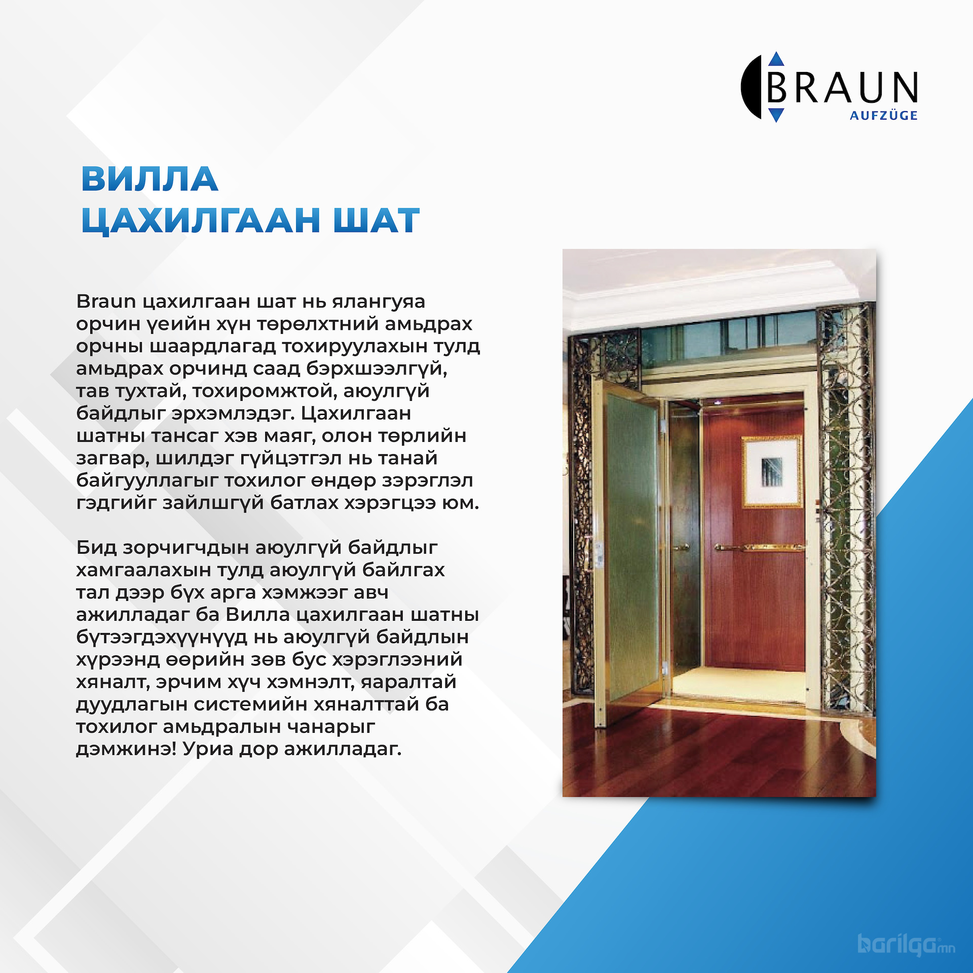 Braun цахилгаан шат нь ялангуяа орчин үеийн хүн төрөлхтний амьдрах орчны шаардлагад тохируулахын тулд амьдрах орчинд саад бэрхшээлгүй, тав тухтай, тохиромжтой, аюулгүй байдлыг эрхэмлэдэг. Цахилгаан шатны тансаг хэв маяг, олон төрлийн загвар, шилдэг гүйцэтгэл нь танай байгууллагыг тохилог өндөр зэрэглэл гэдгийг зайлшгүй батлах хэрэгцээ юм.